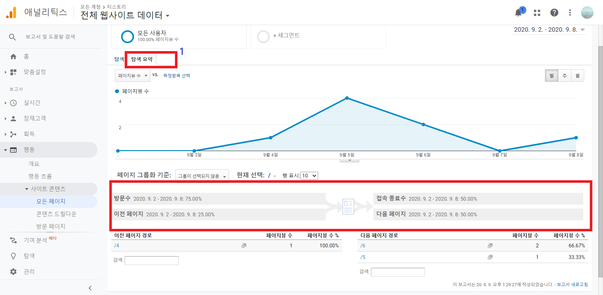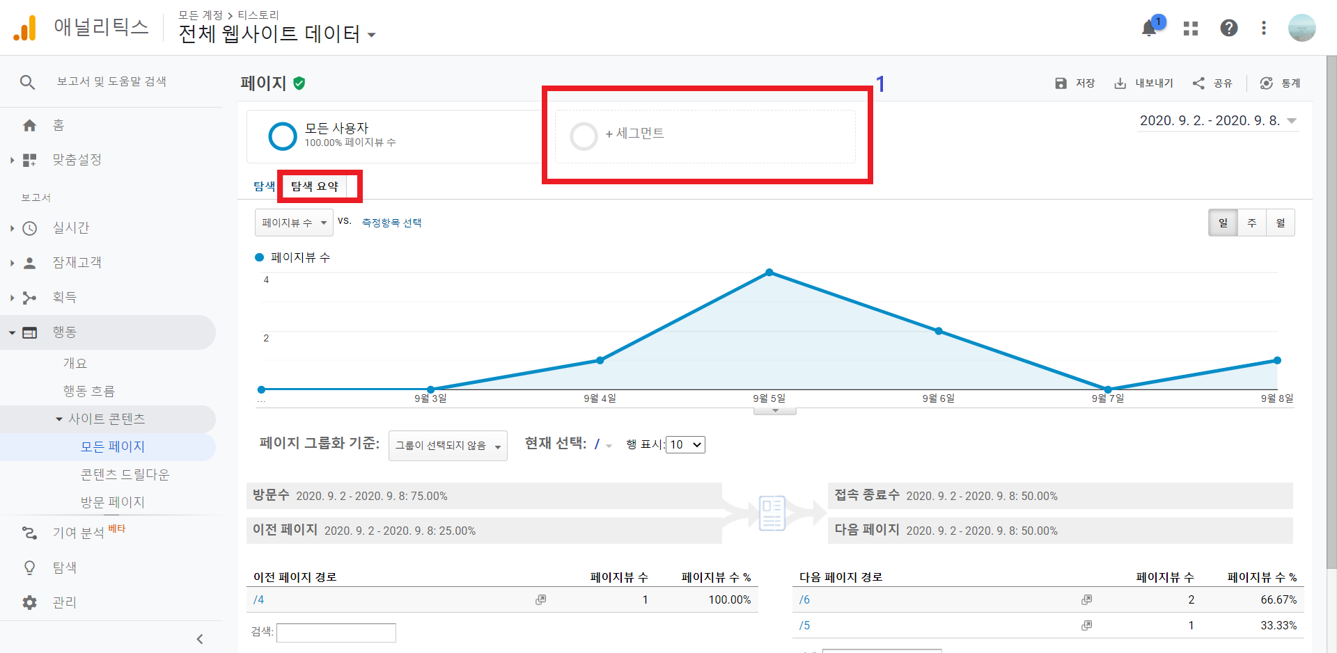 탐색 요약 보고서를 통해 특정 페이지를 기준으로