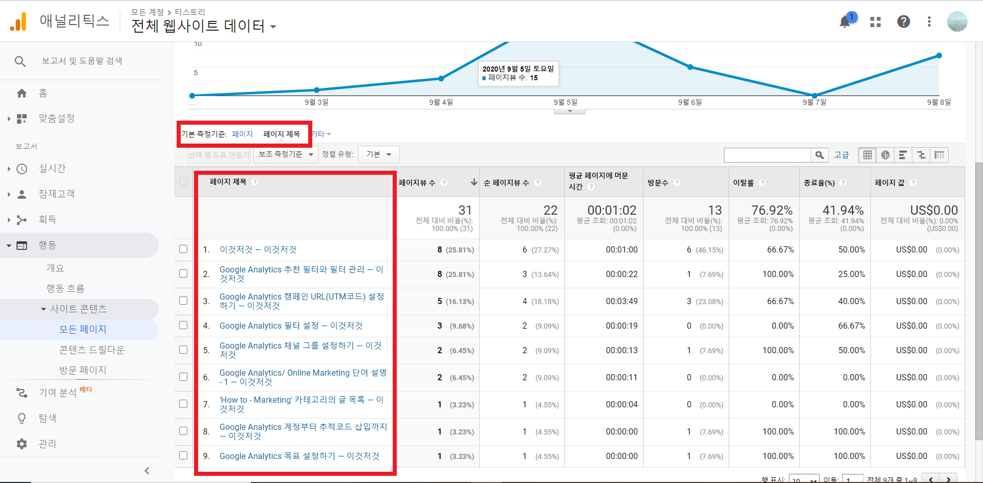 구글 애널리틱스 행동 > 사이드 콘텐츠 > 모든 페이지를