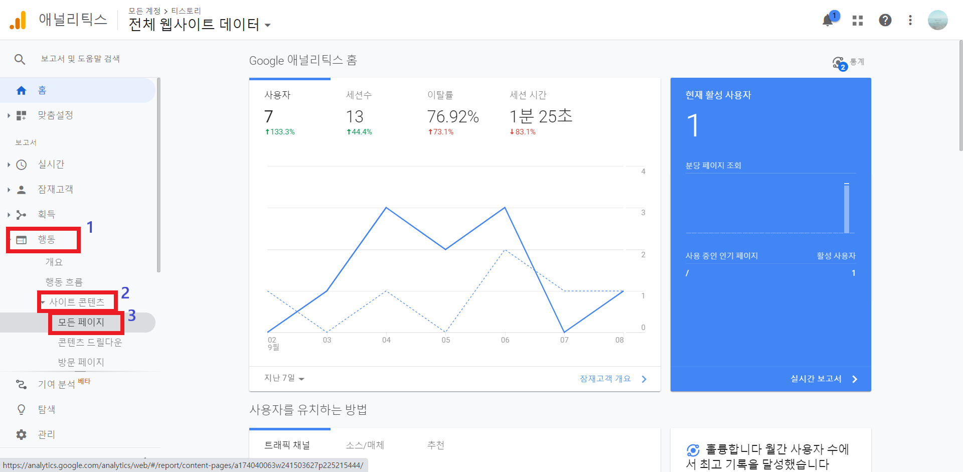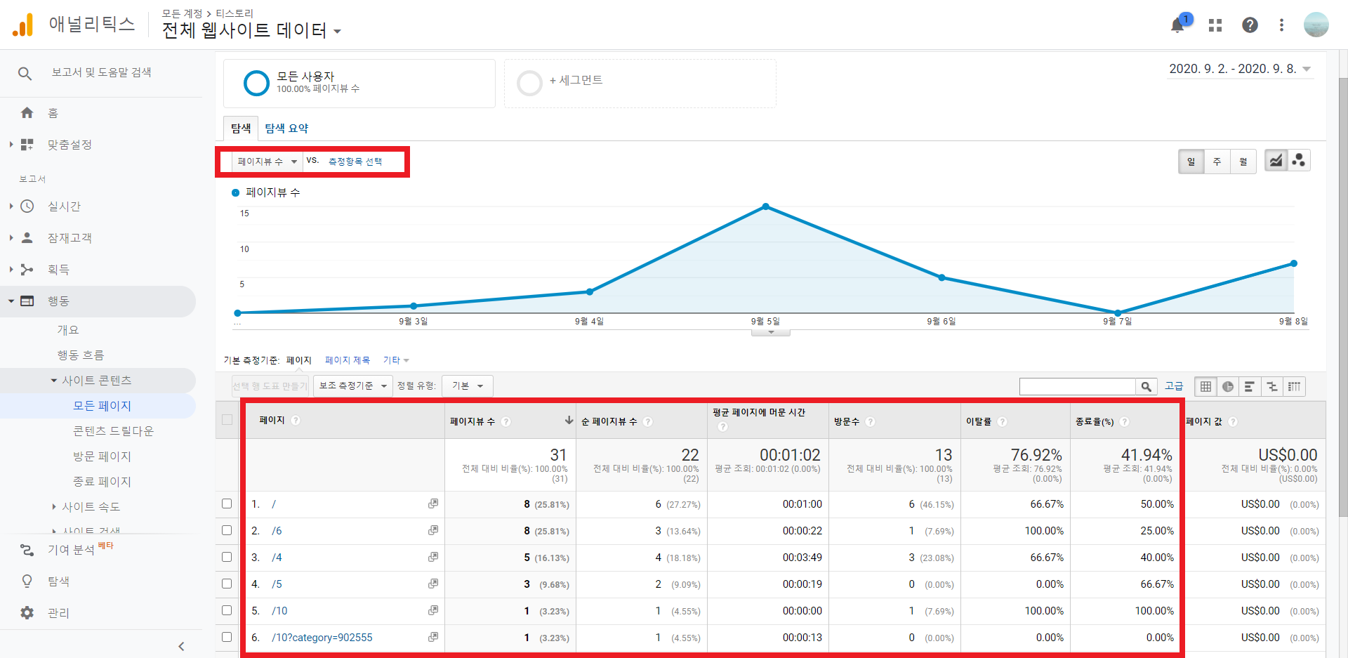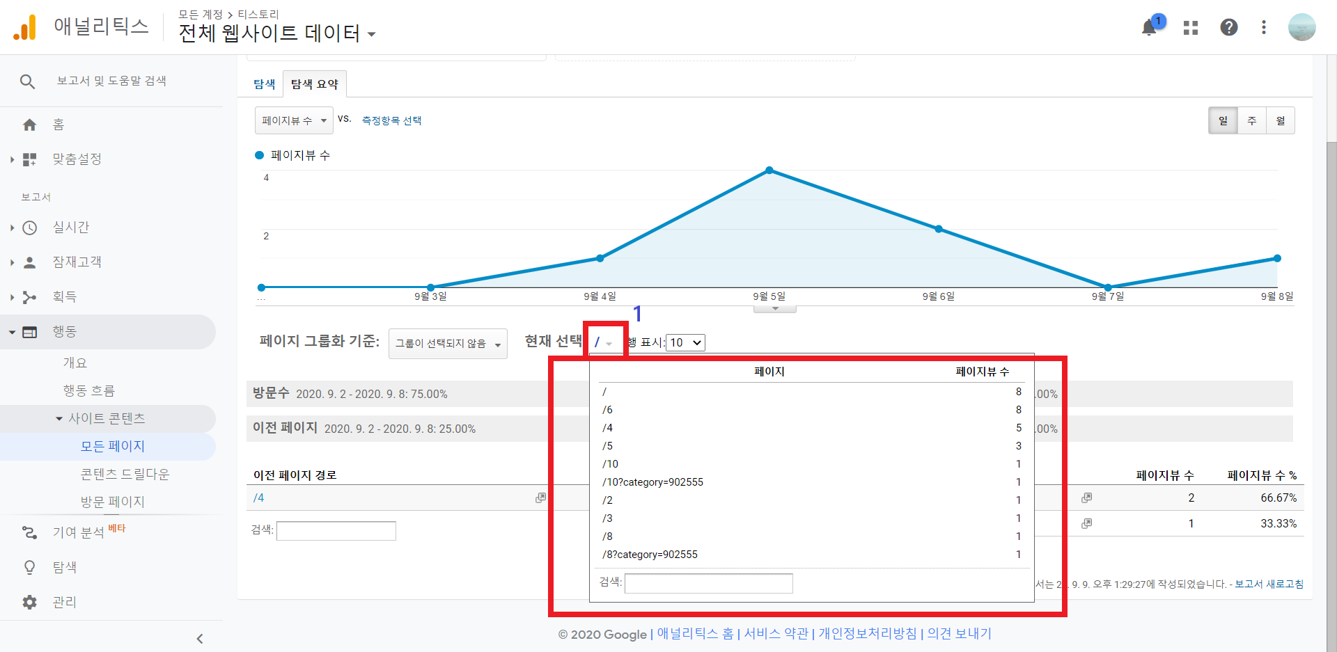 구글 애널리틱스 행동 > 사이드 콘텐츠 > 모든 페이지를
