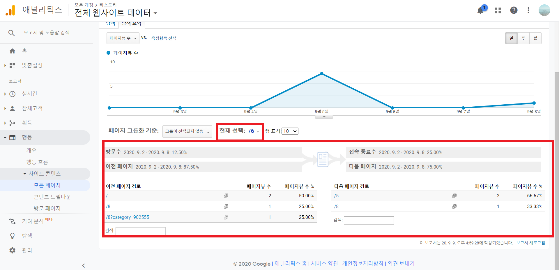 탐색 요약 보고서를 통해 특정 페이지를 기준으로