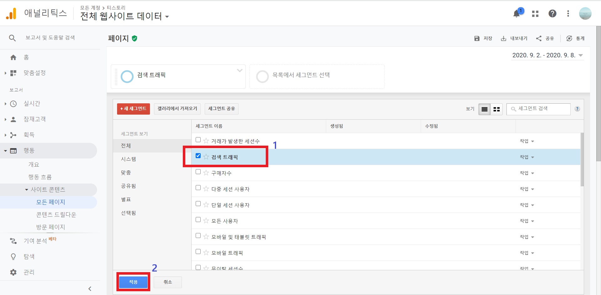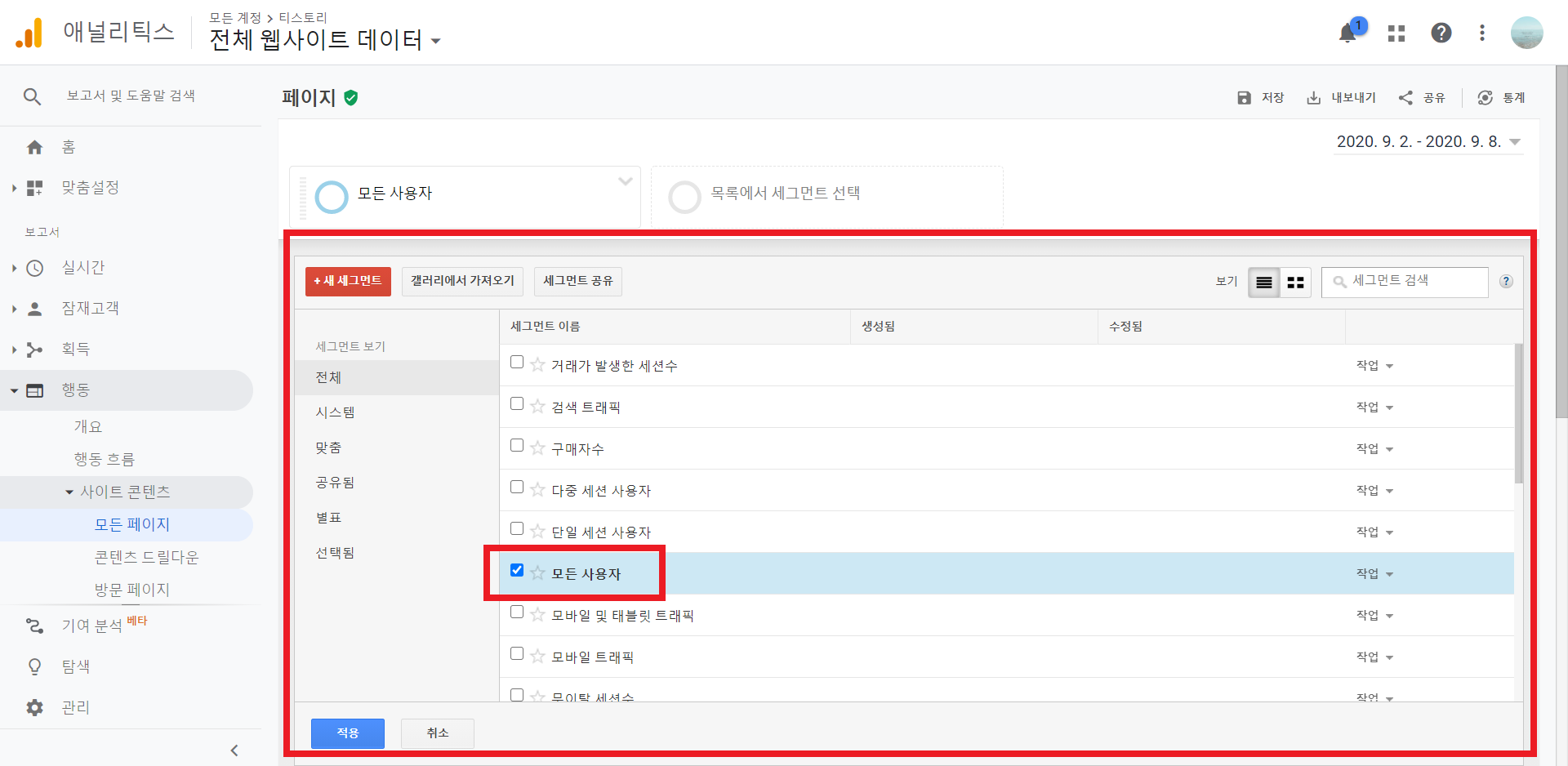 세그먼트를 클릭하게 되면 세그먼트 선택창이 뜨며
