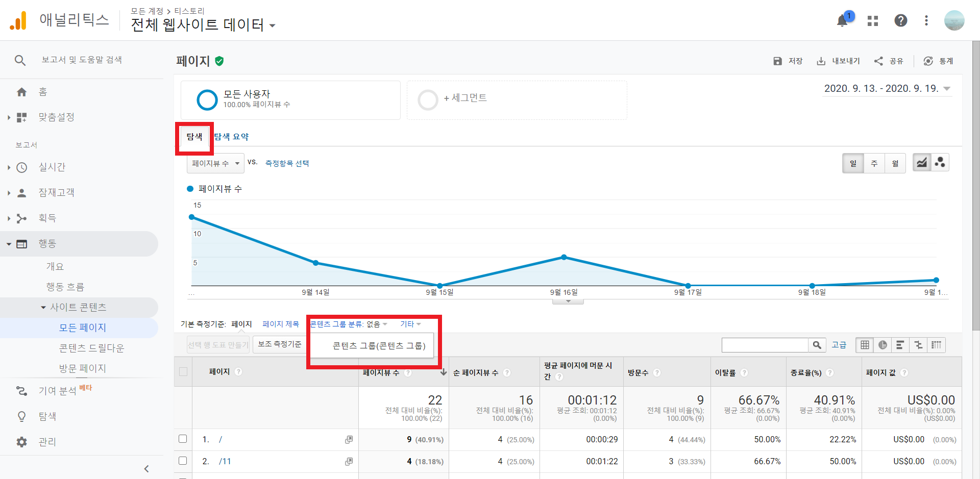 탐색을 선택한 상태에서 콘텐츠 그룹 분류를 클릭한 후