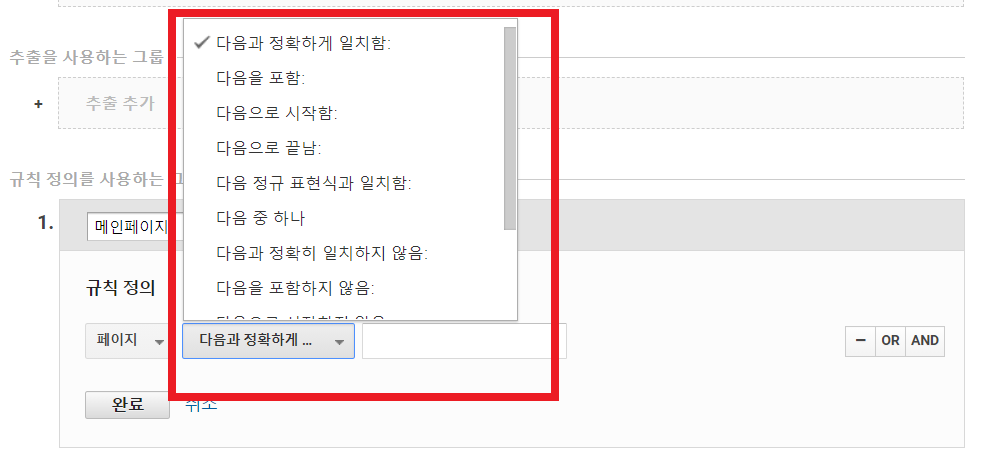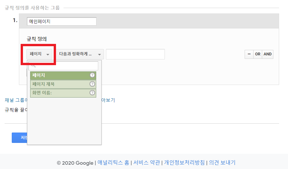 여기서 and를 고르고 Google Analytics 카테고리는 제외하여