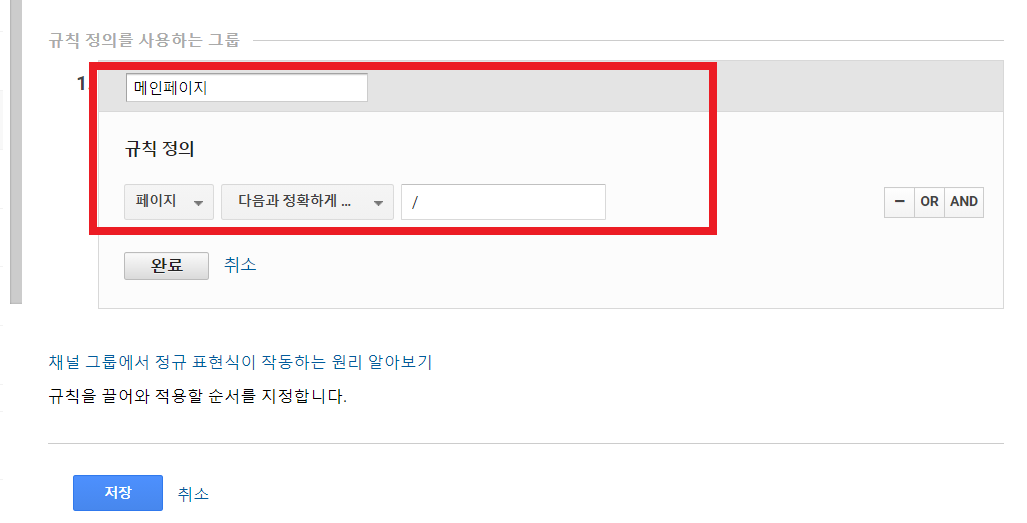 채널 그룹 설정의 규칙 입력란과 동일한 형태를 지닙니다