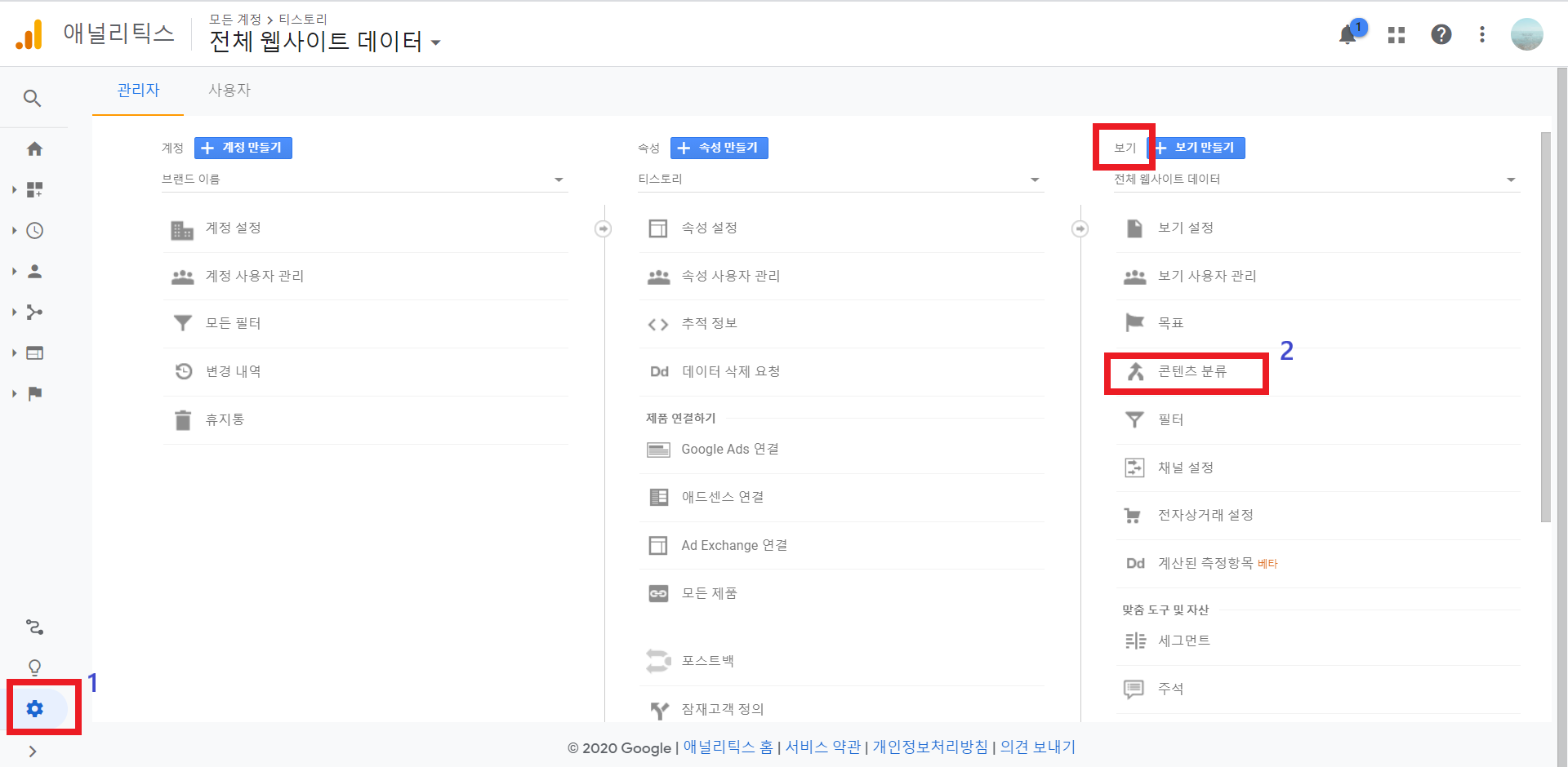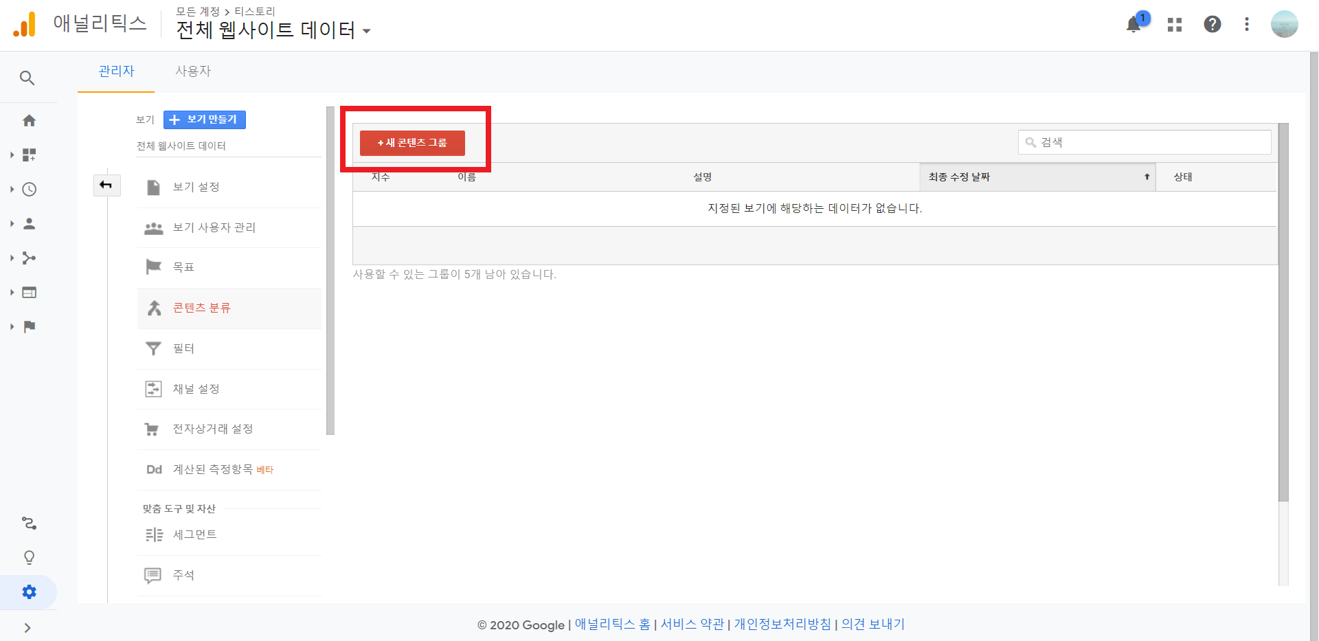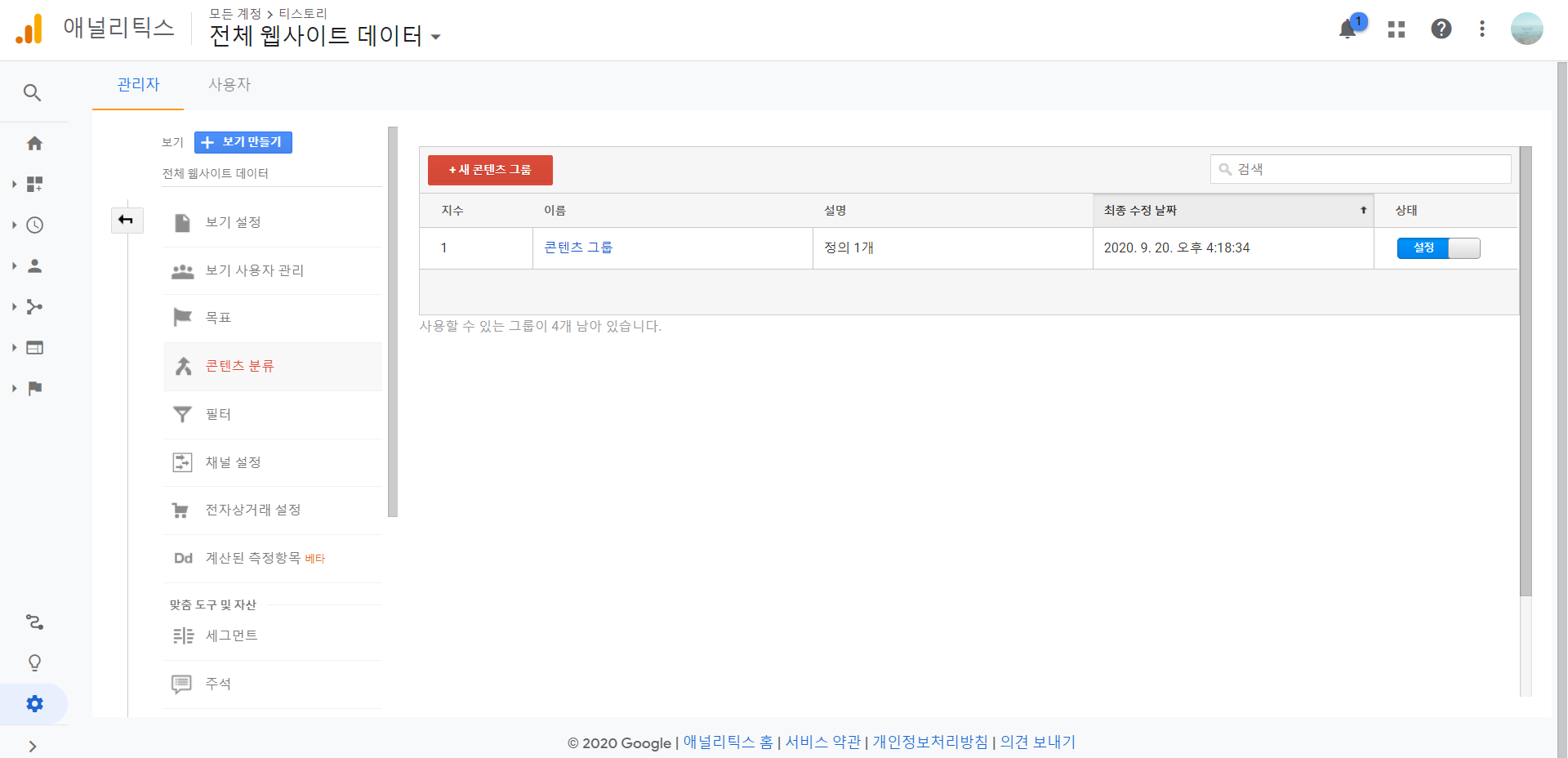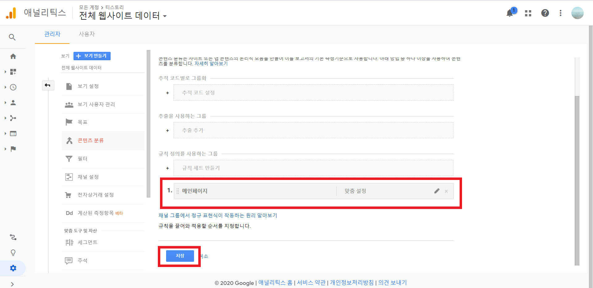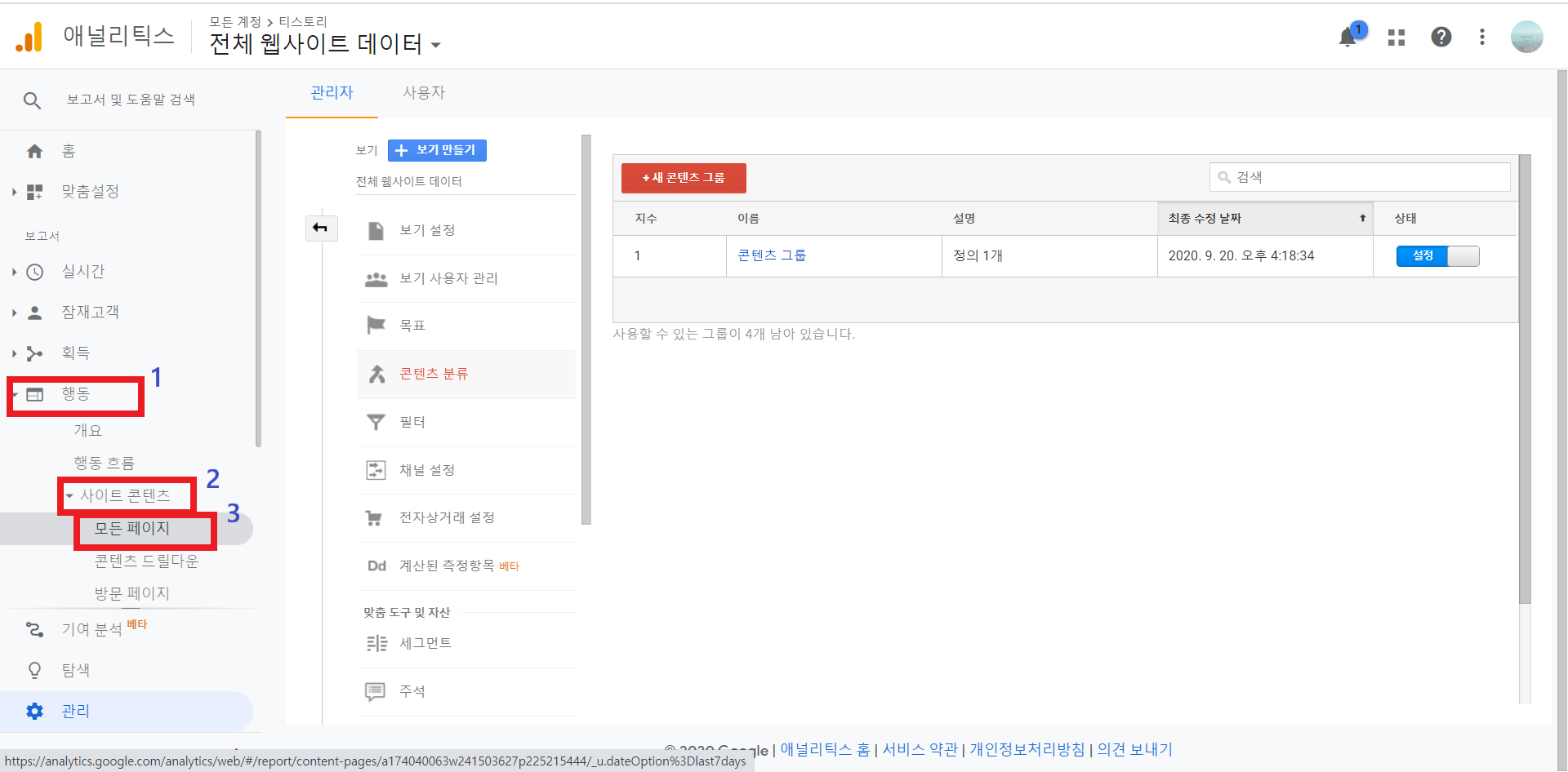 구글 애너리틱스 설정 > 보기 > 콘텐츠 분류를 통해