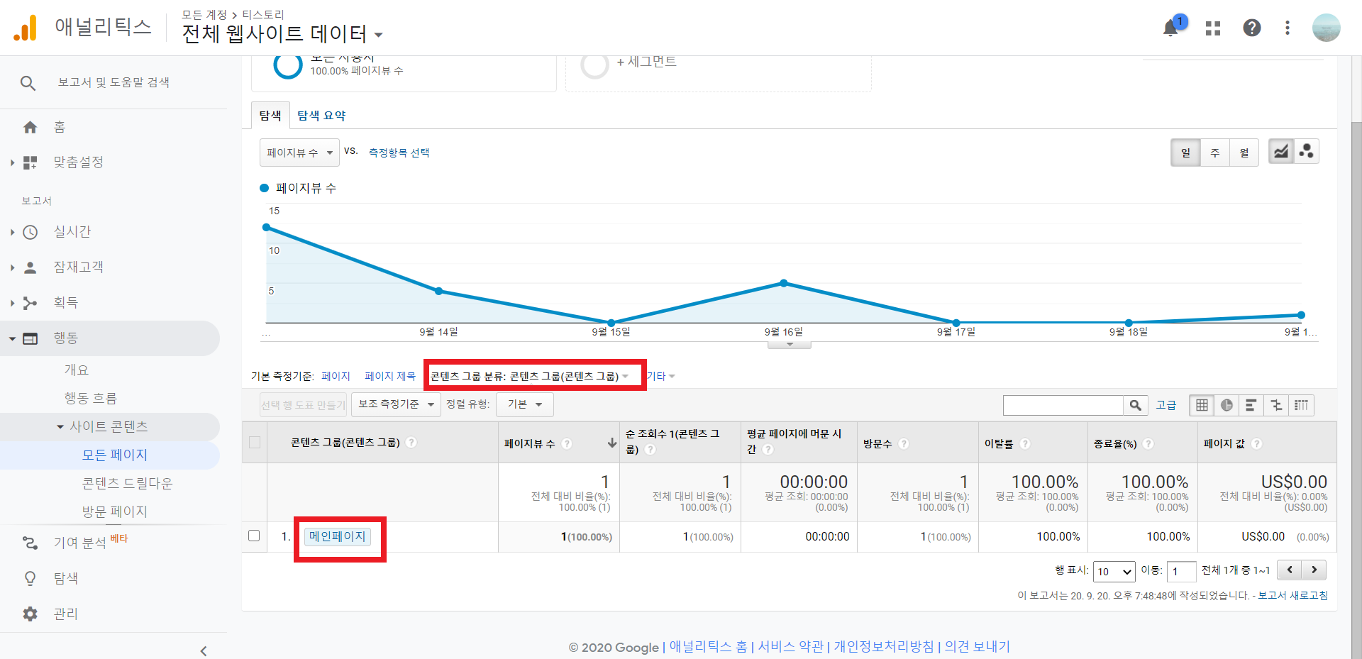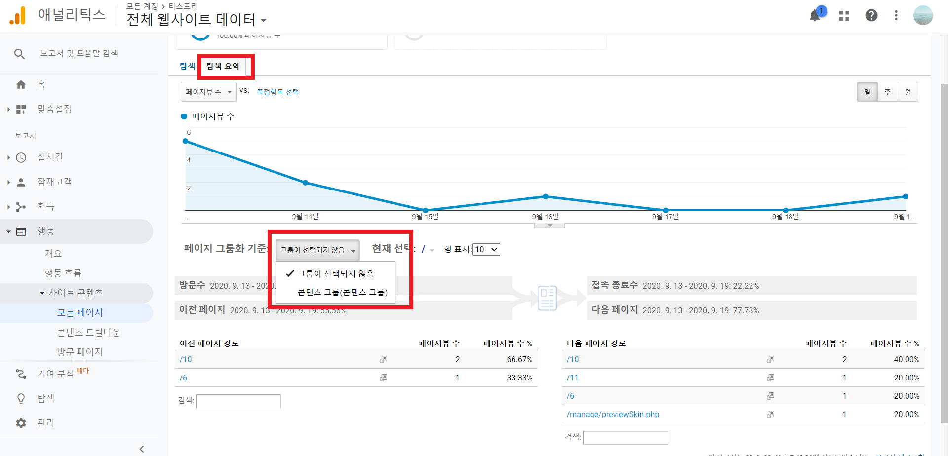 행동에서 모든 페이지 뷰를 검토할 때