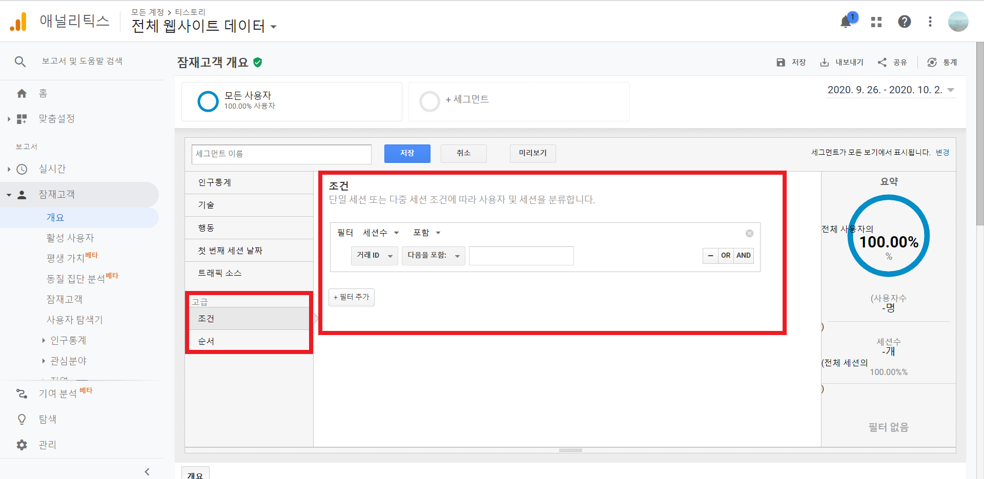 조건 필터에서는 사용자와 세션수를 설정할 수 있습니다