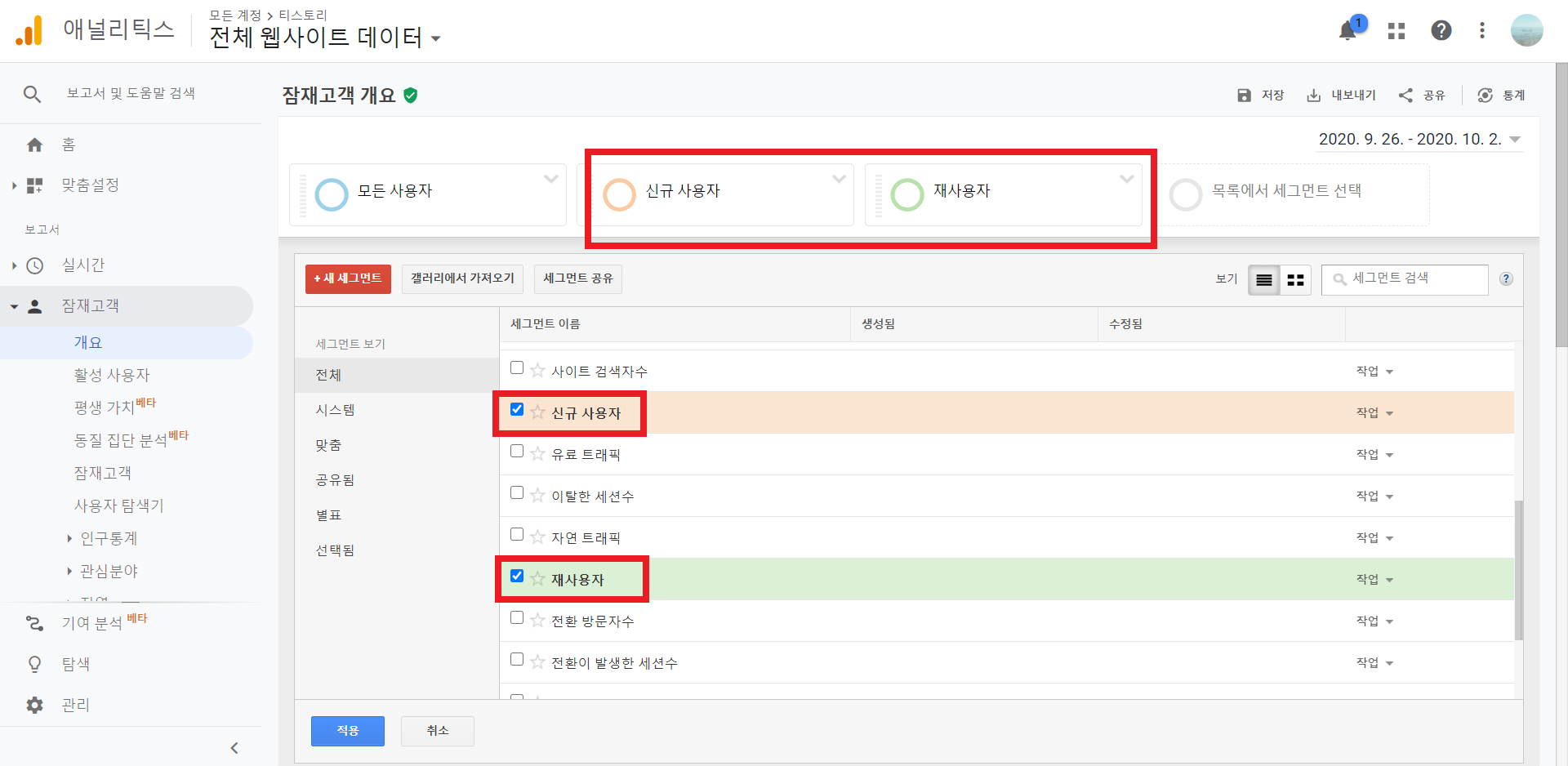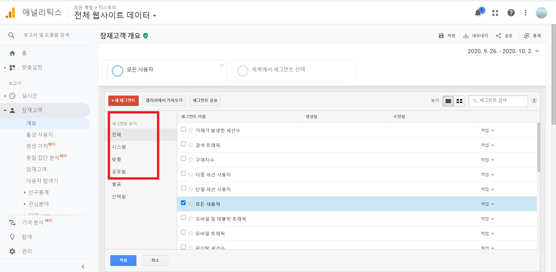 목록에서 세그먼트 선택을 클릭하면 세그먼트 창이 나오게 됩니다