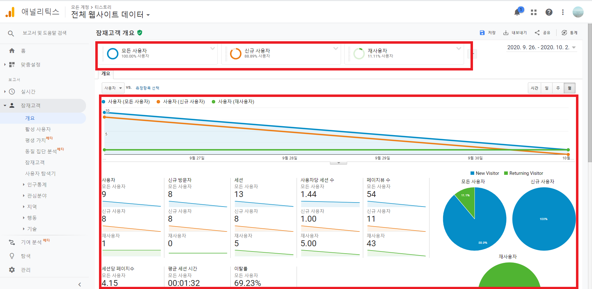 잠재고객 개요와 탐색 요약 보고서 등 트래픽 데이터 보고서에서