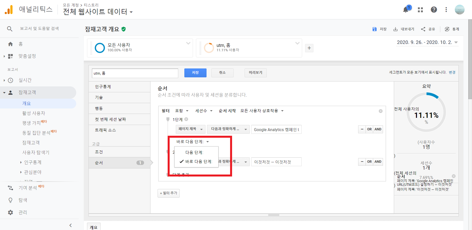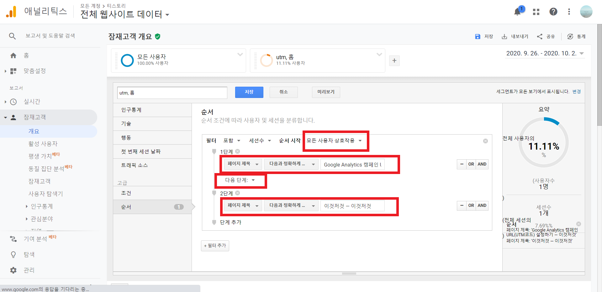 첫 순간 세그먼트 순서를 따라야 데이터가 집계됩니다