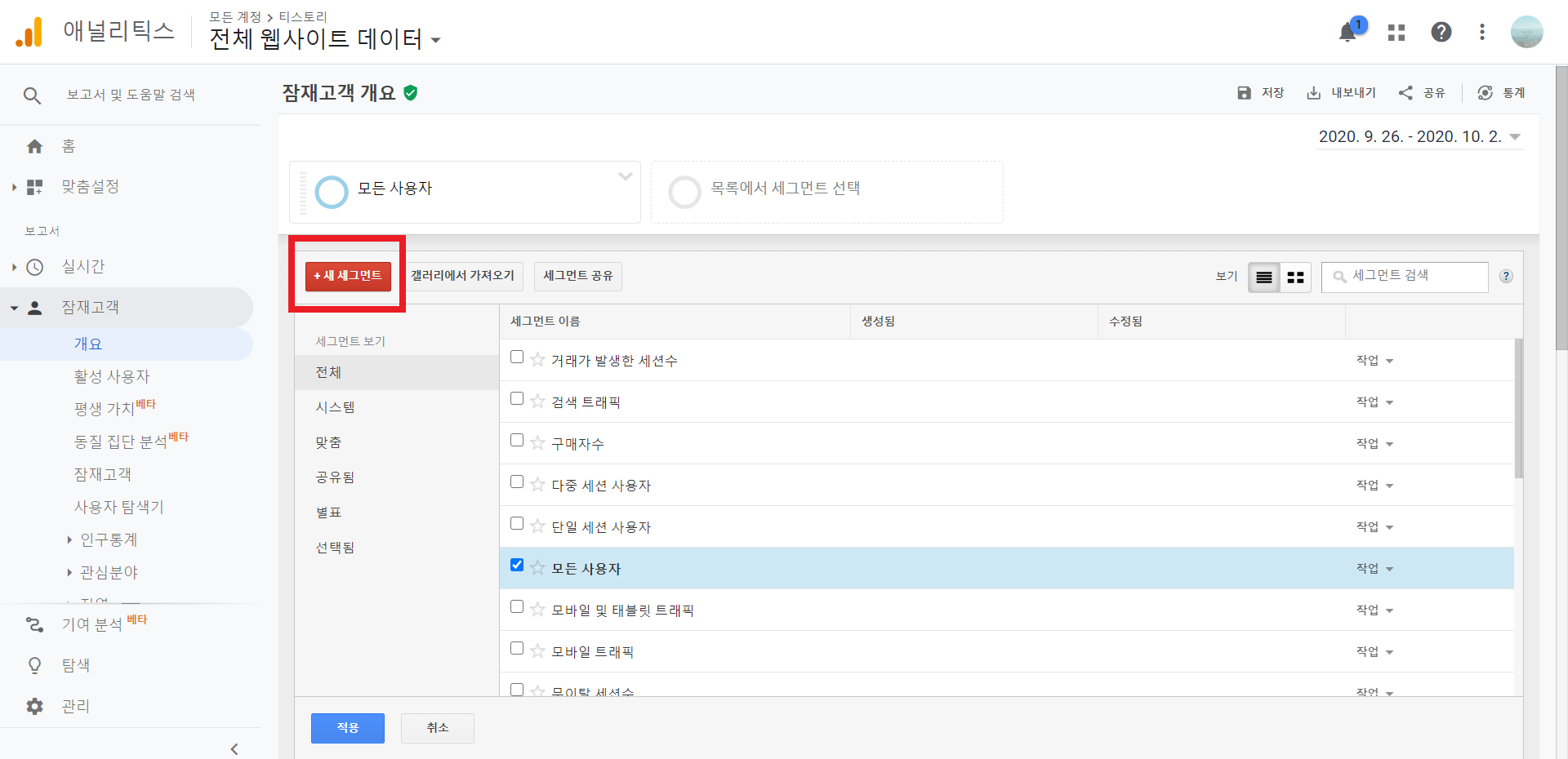 목록에서 세그먼트 선택을 클릭하면 세그먼트 창이 나오게 됩니다