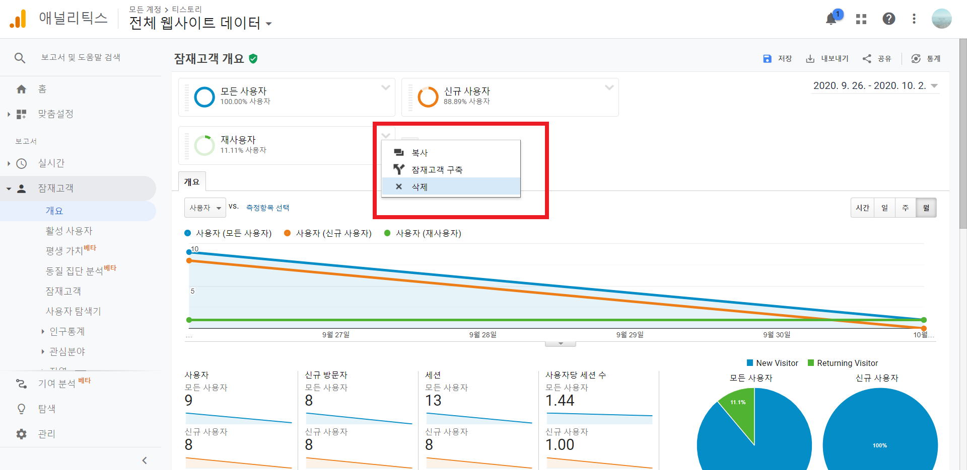 적용한 세그먼트를 삭제하려면 화살표를 클릭한 후 삭제를 누르거나