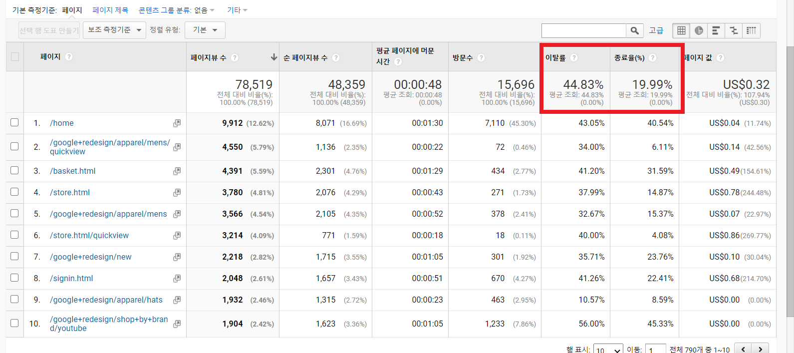 페이지 뷰 수가 가장 많고 그만큼 종료율도 가장 높게 잡힌다