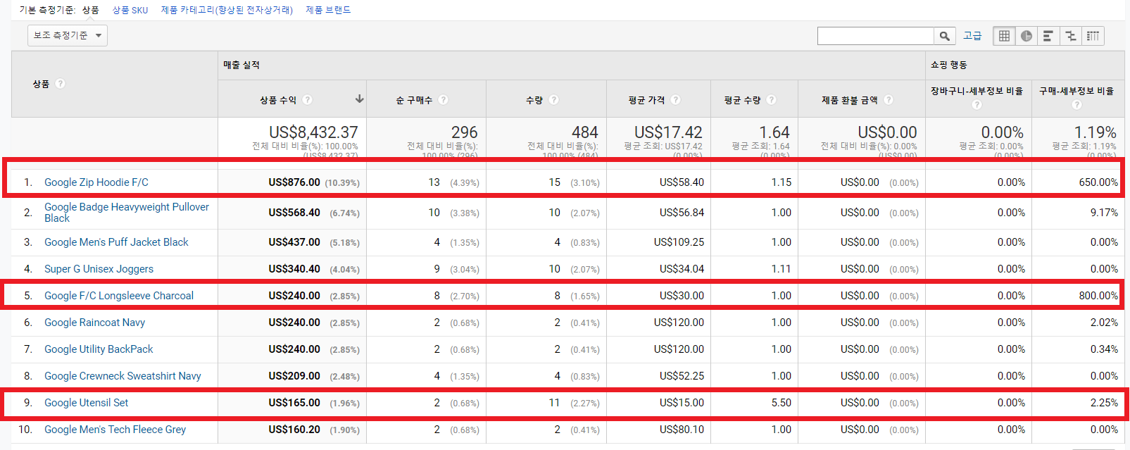 1번 상품 Google Zip Hoodie의 상품 수익은 $876.00로