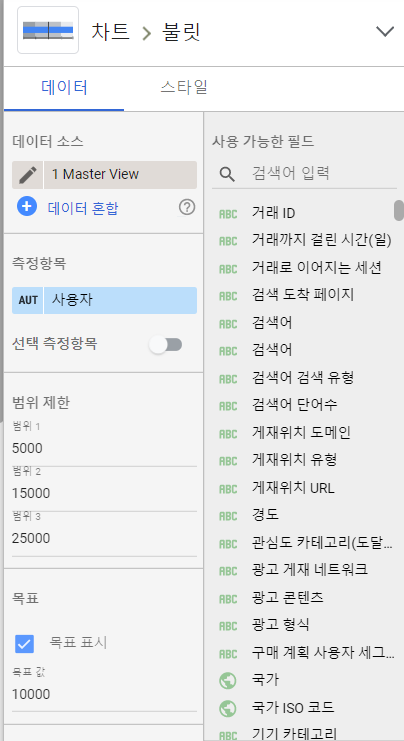 KPI를 제외한 범위와 목표의 수치는 불릿 차트의 데이터 탭에서 직접 설정할 수 있다