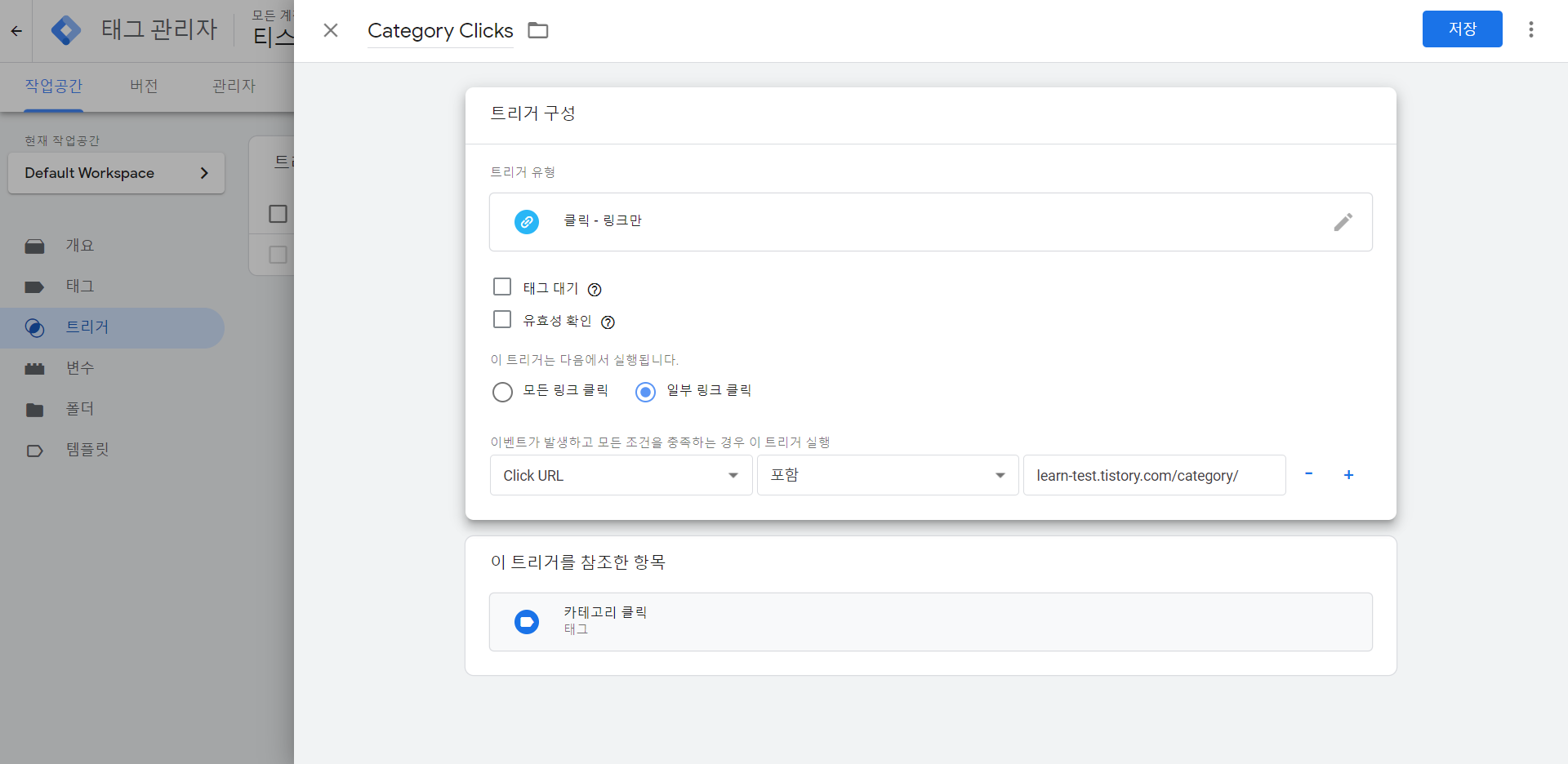 조건을 Click URL이 learn-test.tistory.com/category/를 포함으로 설정을 해뒀는데