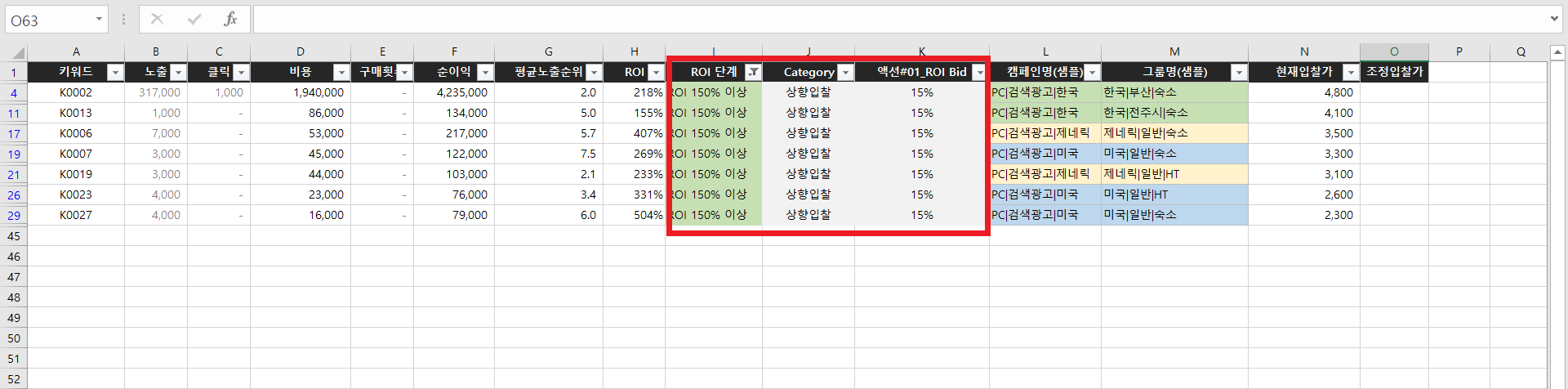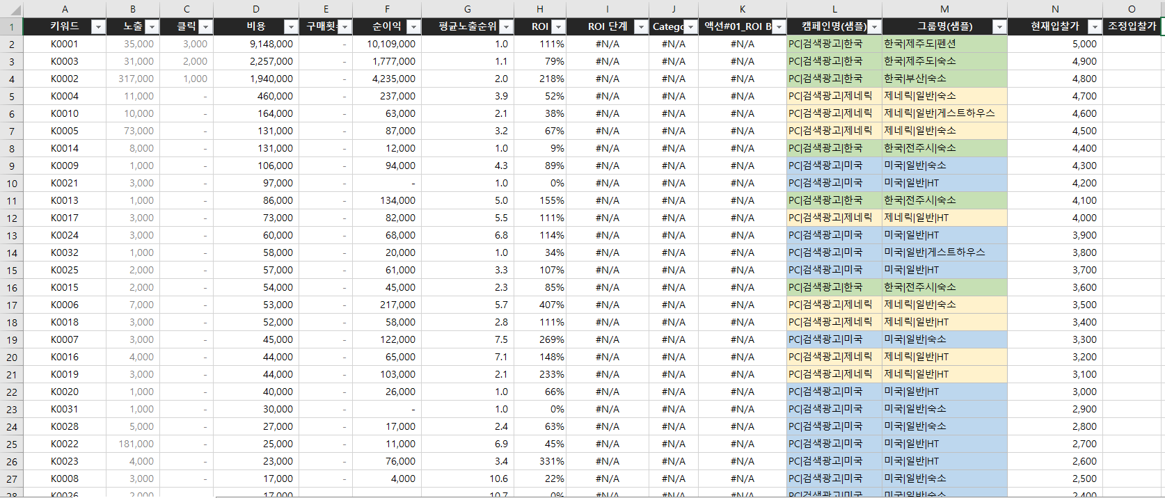 그렇게 된다면 각 키워드마다 ROI 단계, 액션, 조정치가 입력이 된다