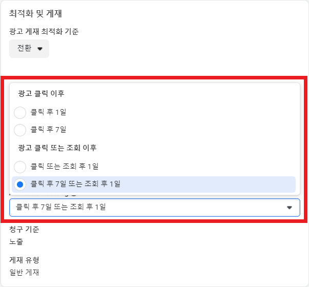 반면 개제 최적화 기준은 사람들에게 광고를 보여주는 기간에 대한 설정으로