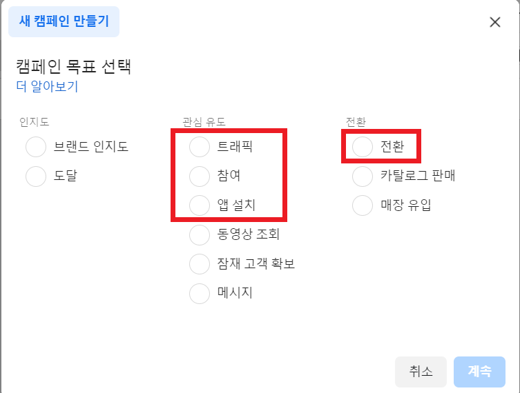 캠페인에서 도달할 목표(인지, 유도, 전환)를 설정할 수 있다
