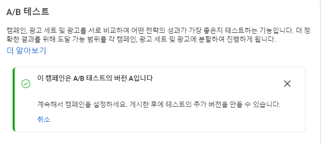 캠페인 목표를 설정하고 나면 a/b 테스트와 캠페인 예산 최적화를 설정할 수 있다