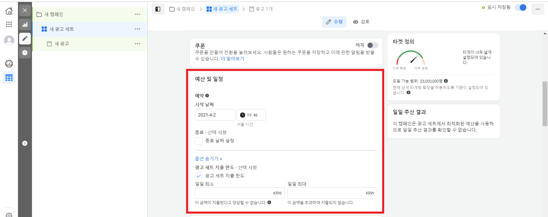 광고 세트에서도 일일 예산과 기간 예산 설정이 가능하다