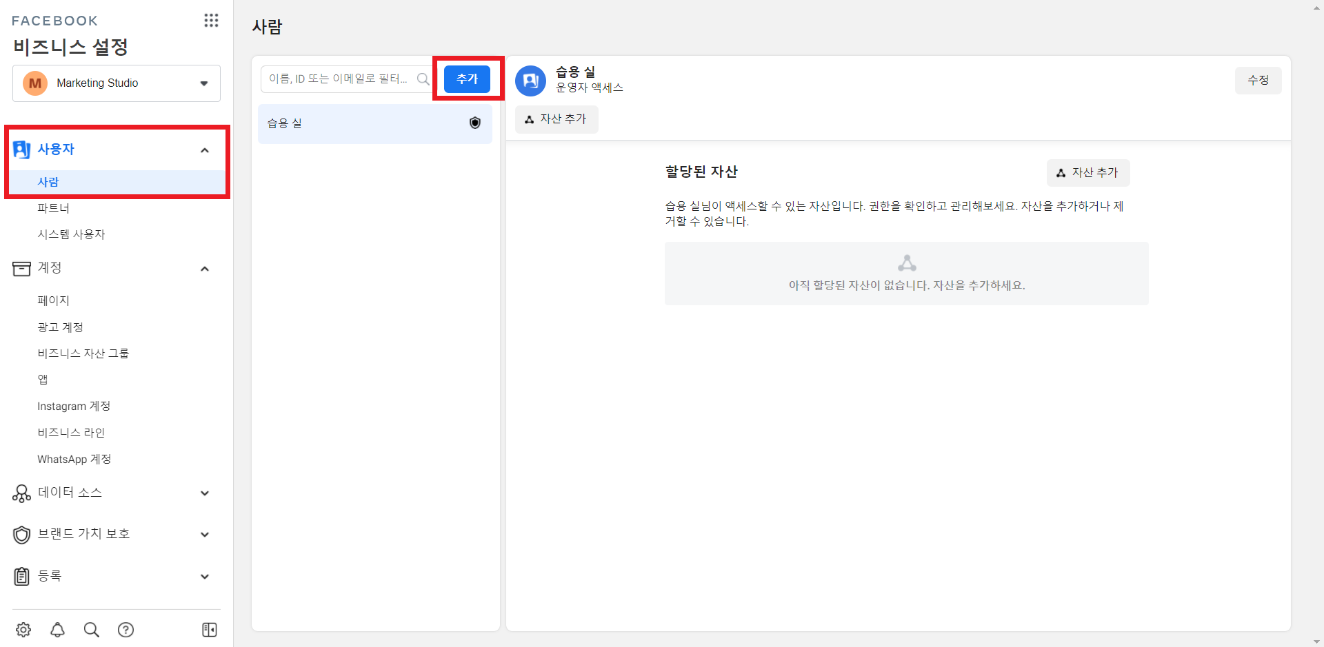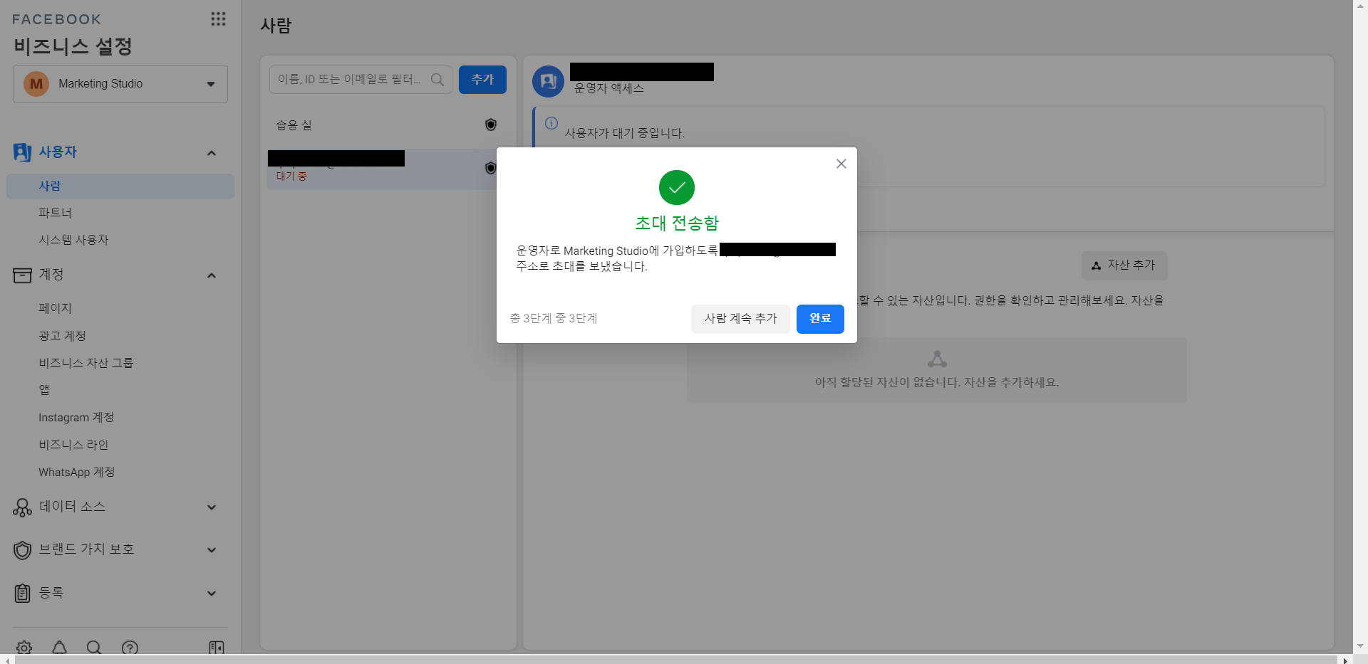 누군가를 초대하기 전 비즈니스 관리자에 페이지, 광고 계정, 픽셀과 같이 자산들을 연동시켜놨다면