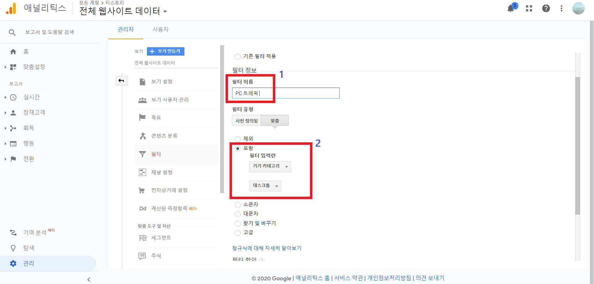 필터는 계정 혹은 보기에 설정할 수 있게 됩니다.