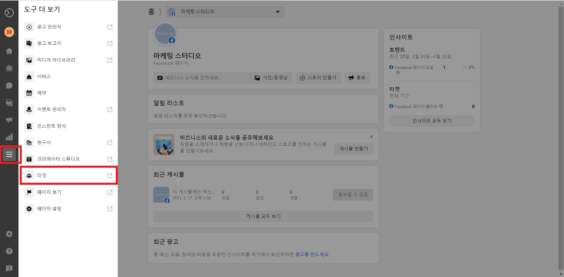 Facebook Business Suite의 도구 더 보기 후 타겟을 선택하면 된다