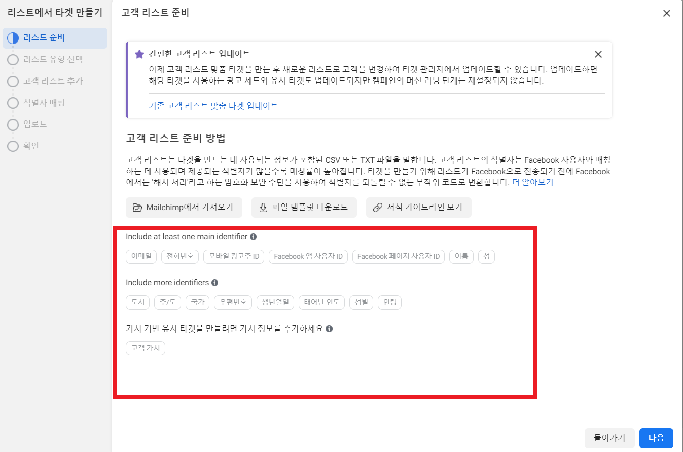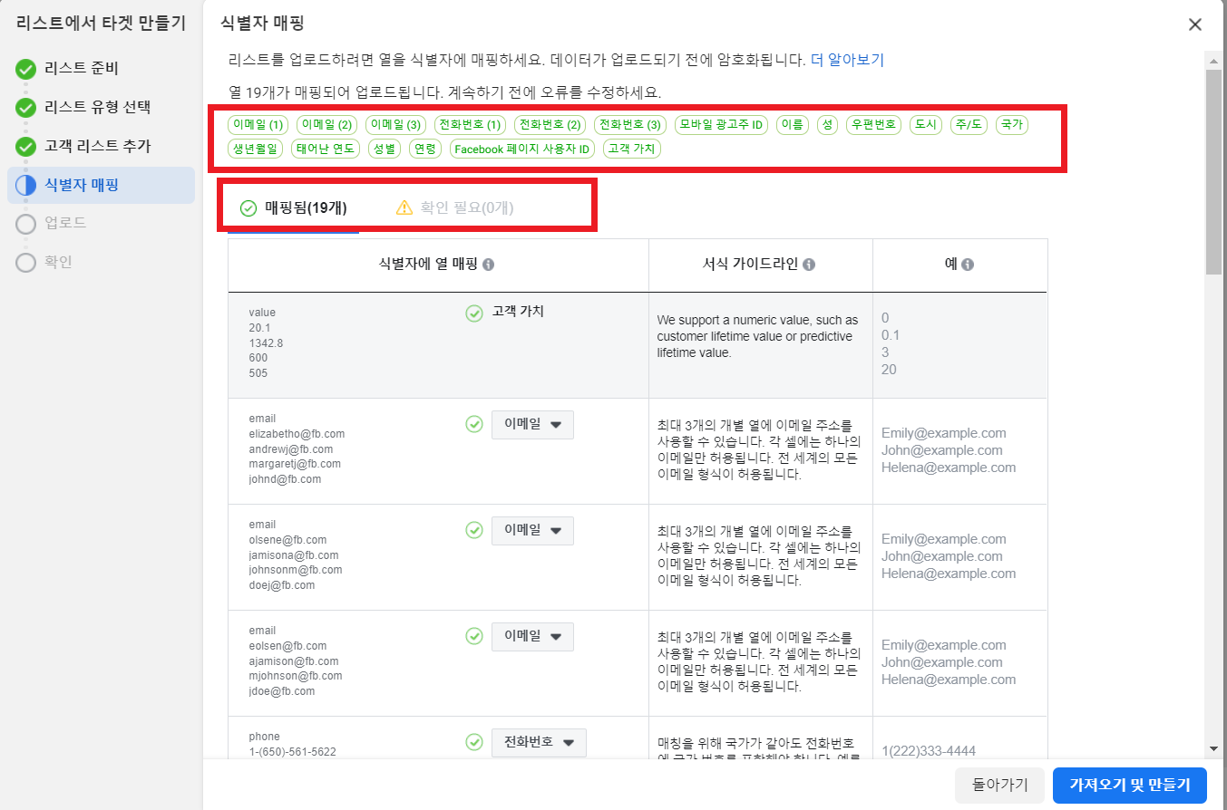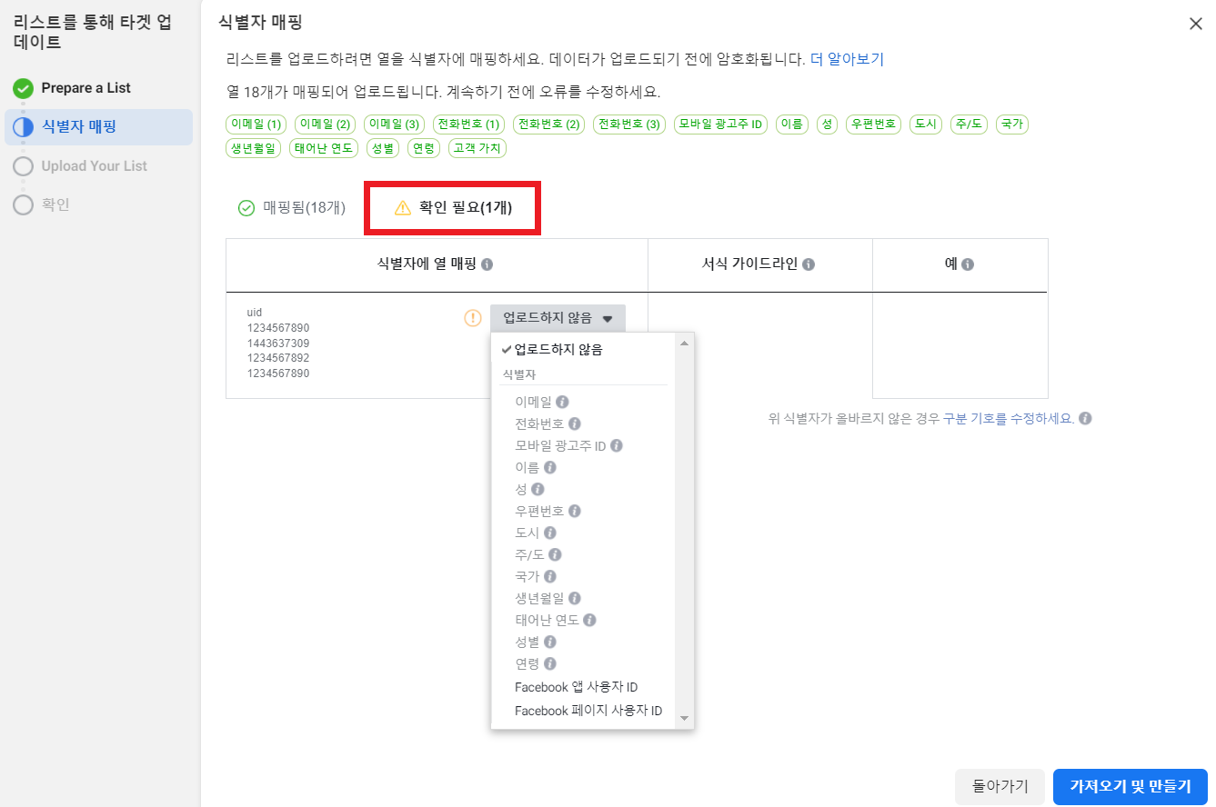 이미 작성해놓은 고객 리스트를 페이스북 식별자(항목)에 맞춰서 업로드하면