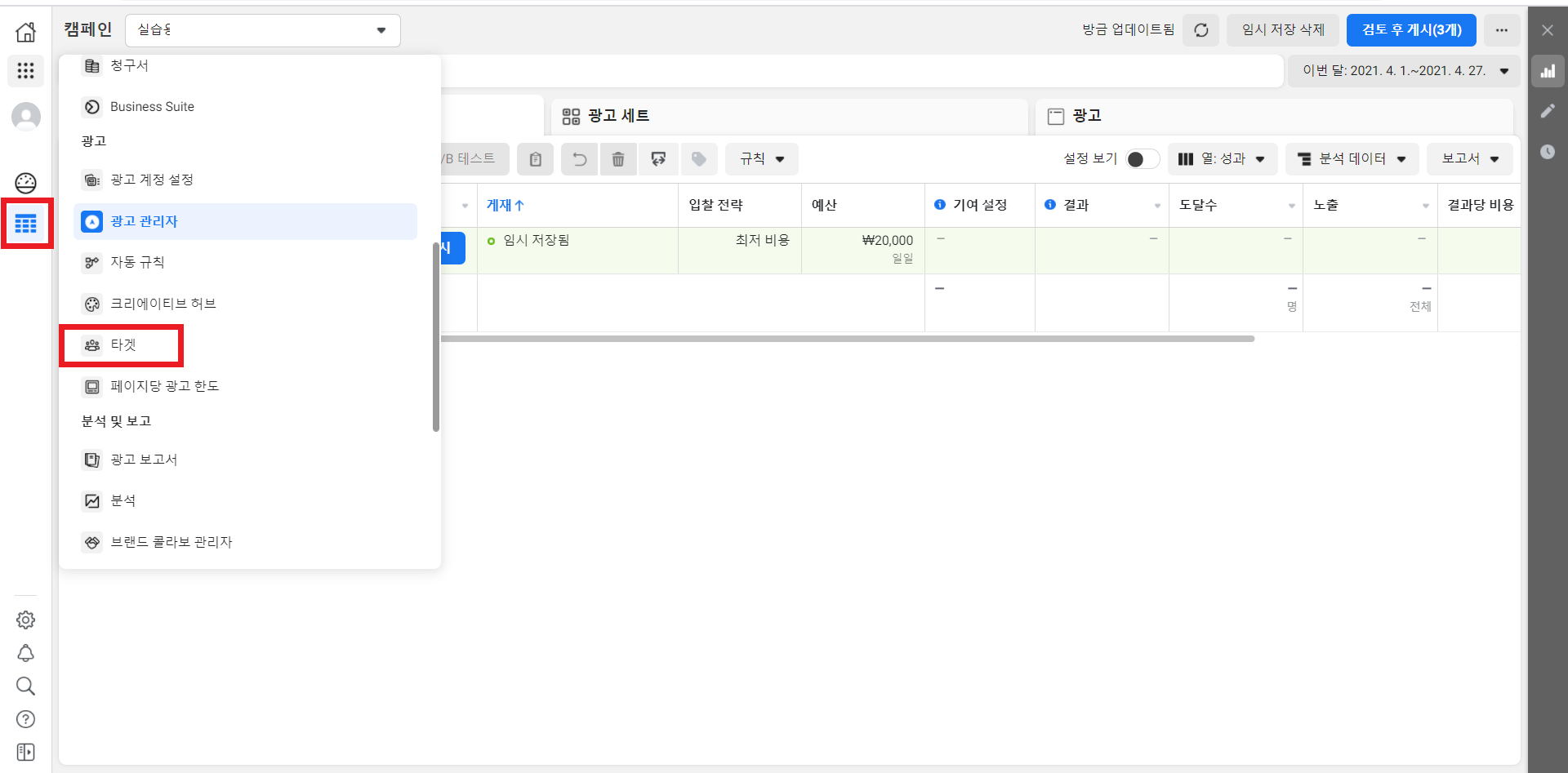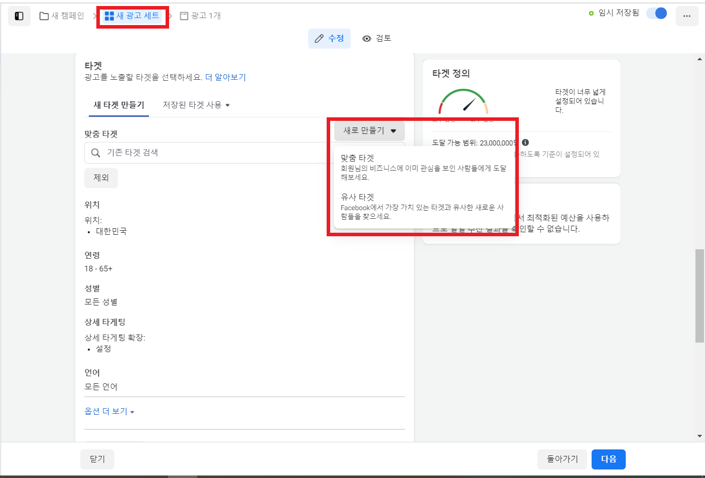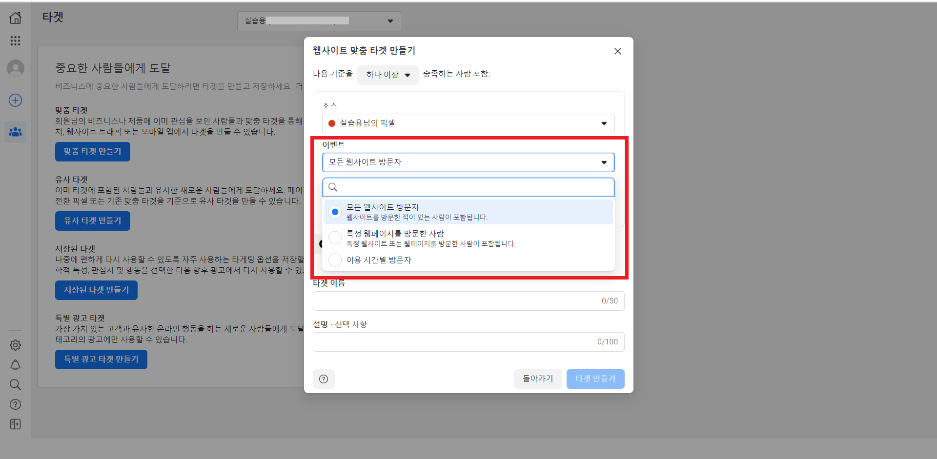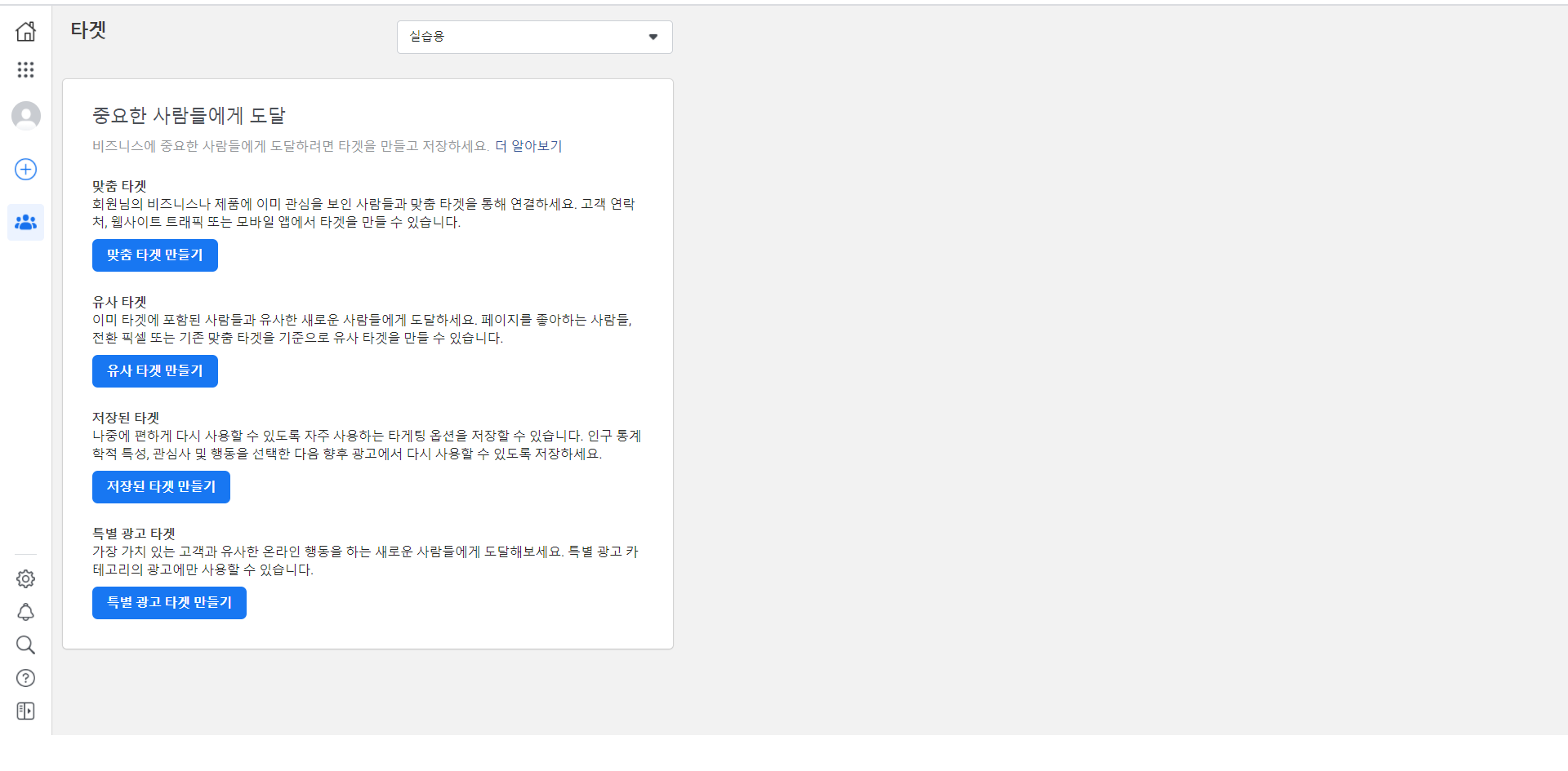 타겟을 만들기 위해선 광고관리자의 세트단에서 새로 만들거나