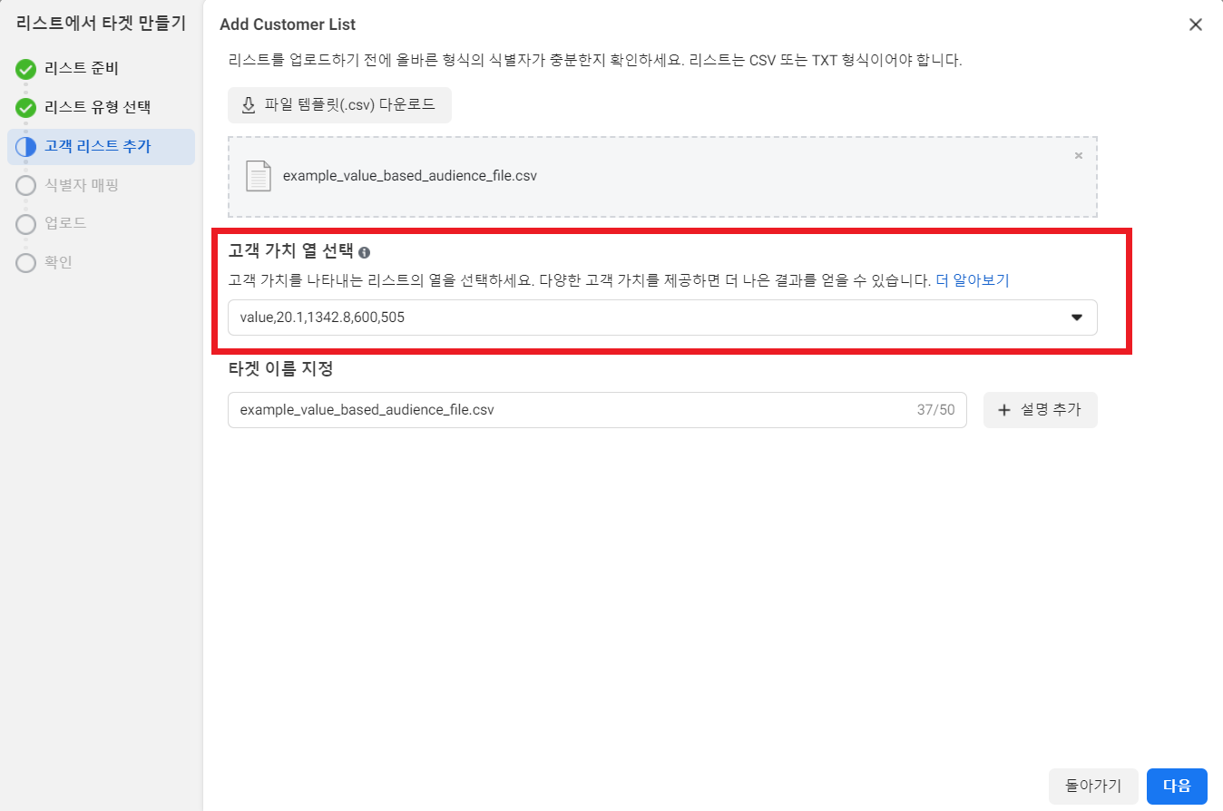 고객 리스트를 업로드할 때 LTV, 고객 평생 가치를 포함하는 파일인지 아닌지 선택할 수 있는데