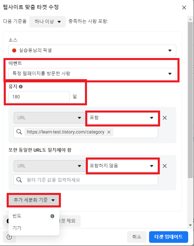 타겟 제외 옵션을 통해 특정 페이지 방문 포함(장바구니, 제품 상세 등)