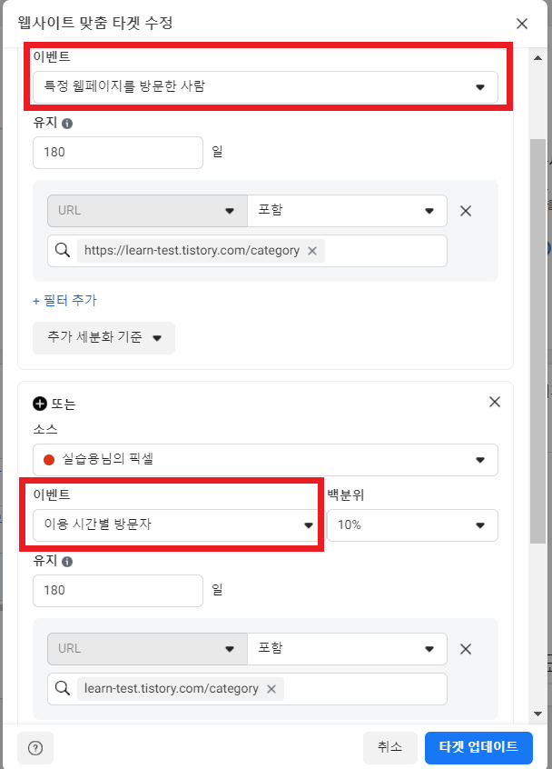 하나 이상의 타겟 이벤트에 대해서 맞춤 타겟을 설정할 수가 있다