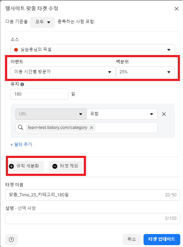 추가적으로 내 소스 기반 맞춤타겟(최대 180일)과는 다르게 최대 유지기간을 365일로 설정할 수 있다