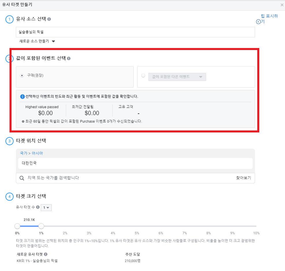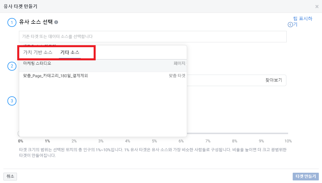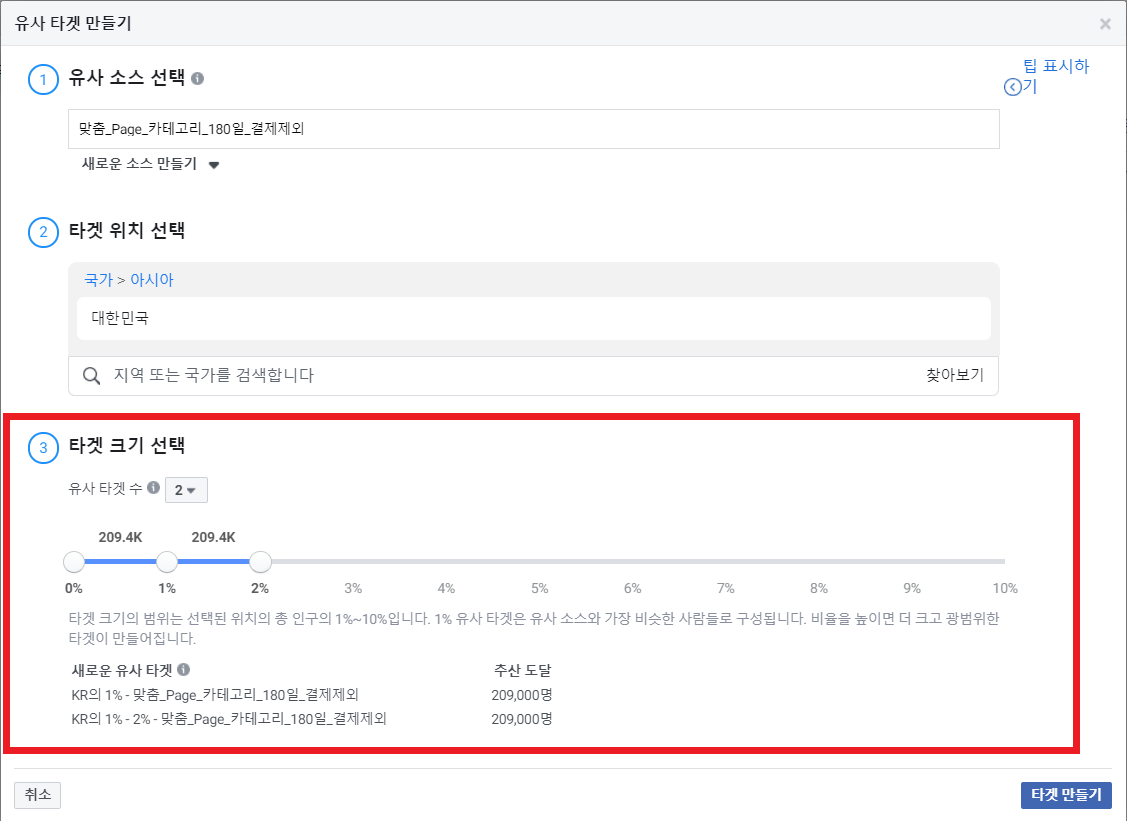 유사 타겟 크기를 설명하자면 1%부터 10%까지 선택할 수 있다