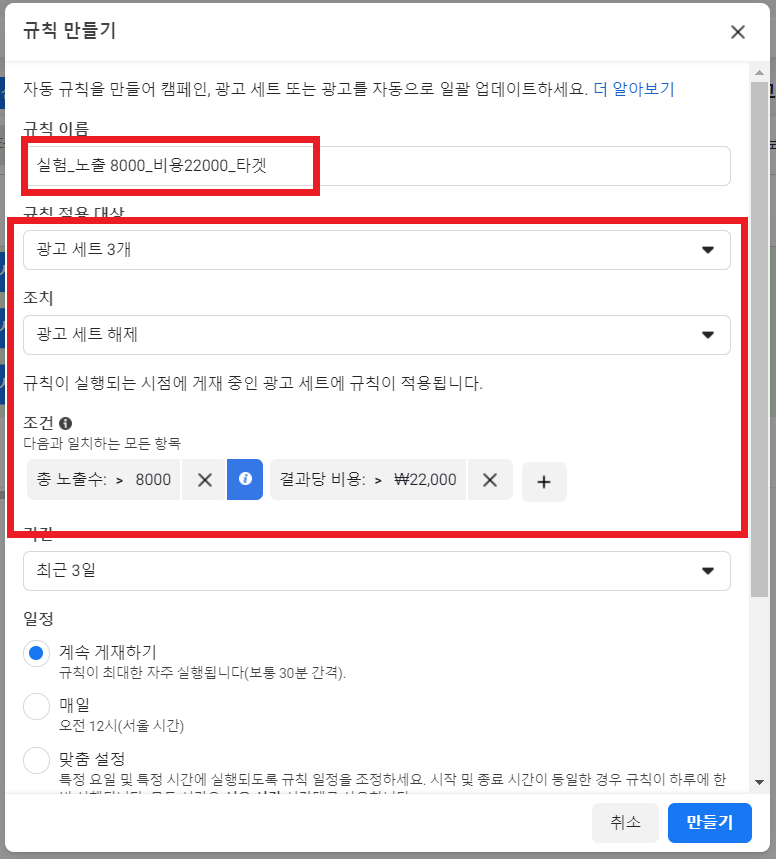 페이스북에서는 규칙 기능을 활용해서 a/b 테스트를 자동화시킬 수 있다