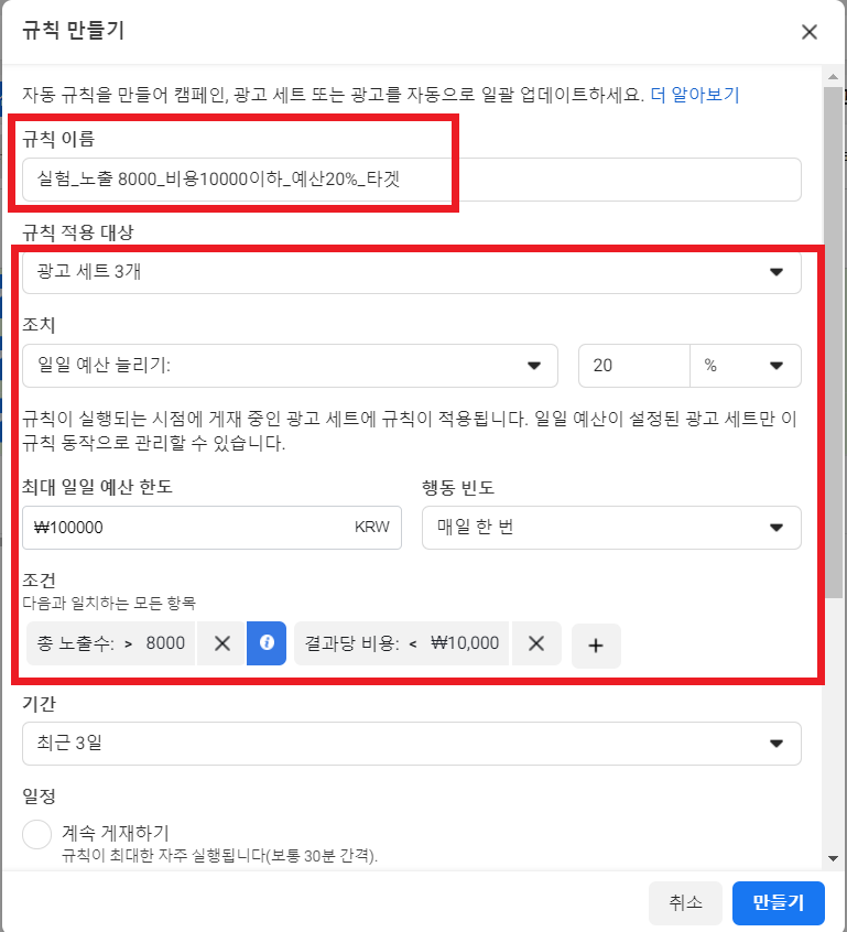 성과가 좋은 세트들의 예산을 추가적으로 올려주는 자동화를 설정할 수도 있다