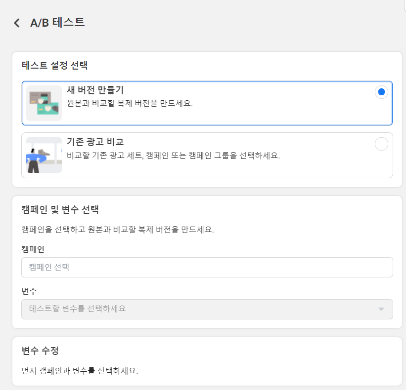 광고 관리자에서 새로운 캠페인을 만들 때 a/b 테스트 설정을 할 수도 있고