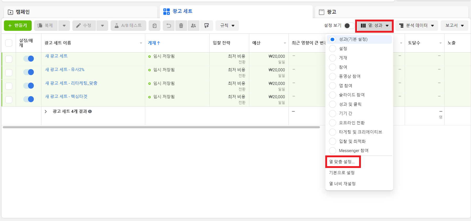 페이스북 광고 성과는 광고 관리자 자체의 보고서 혹은