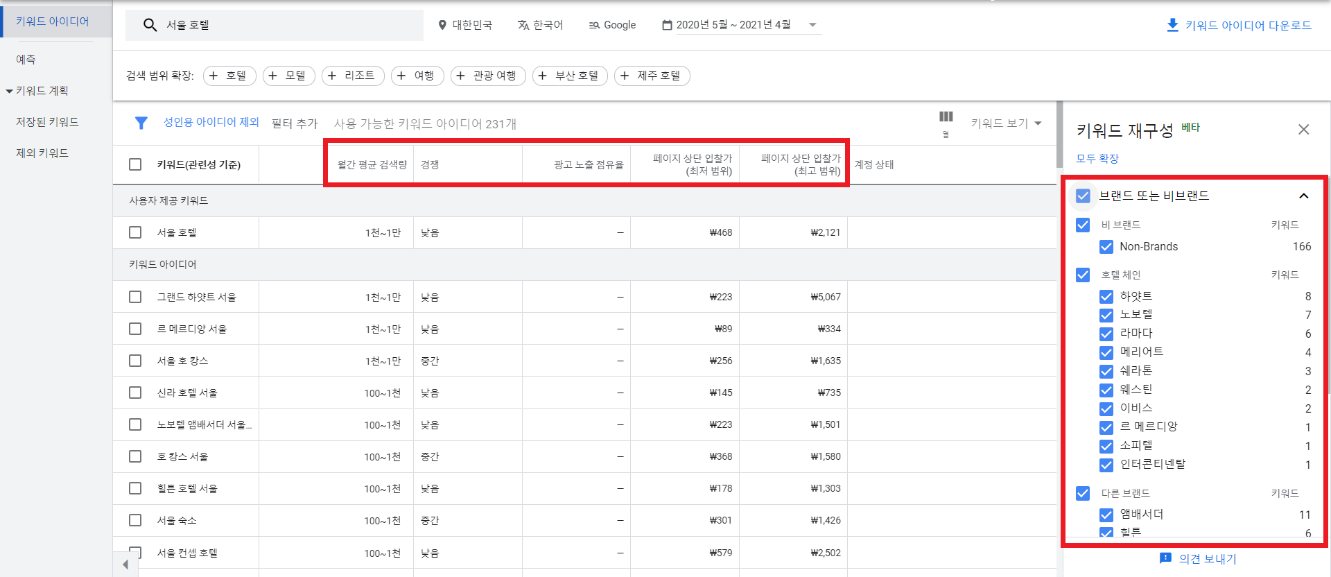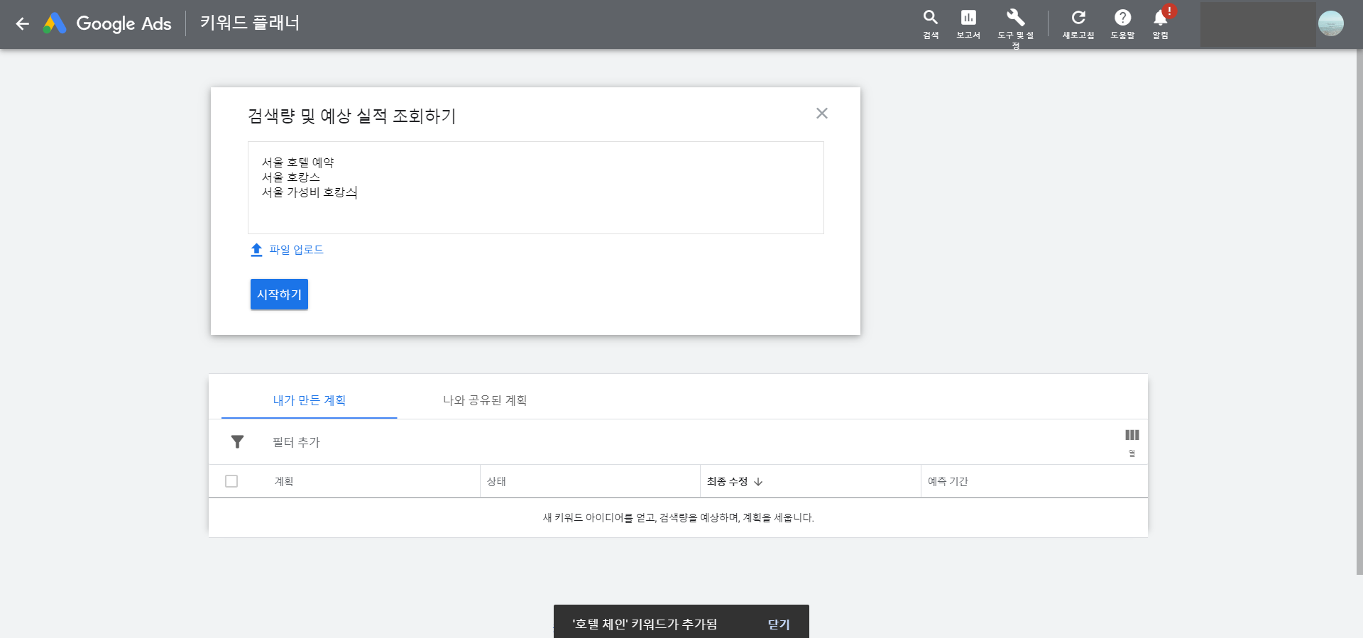 구글 키워드 플래너가 입력된 단어를 바탕으로 새로운 키워드를 제안해준다