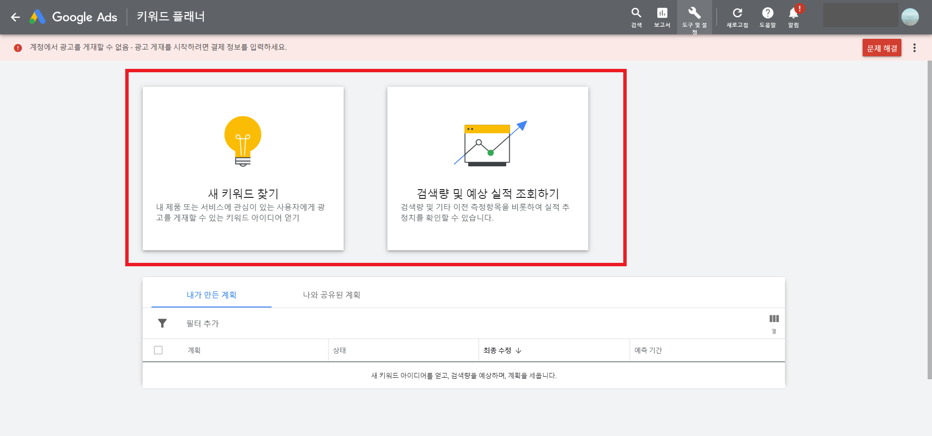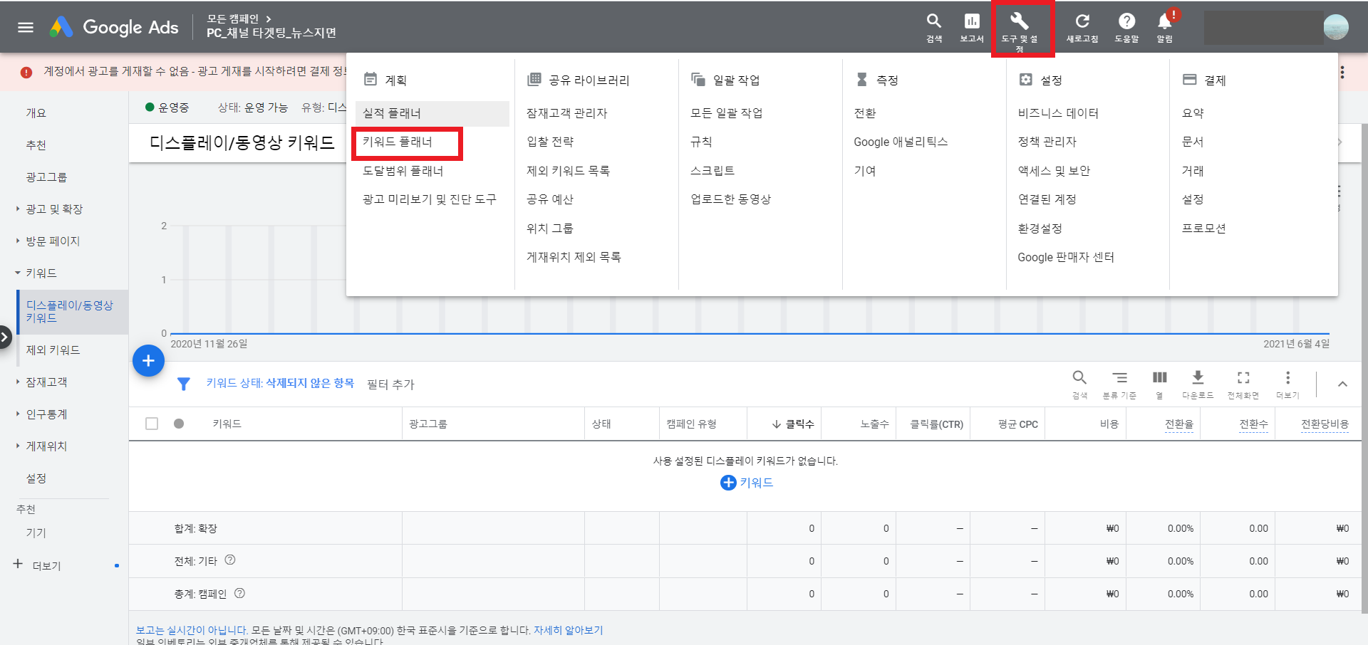 구글 애즈 페이지에서 상단 메뉴바도구 및 설정, 계획,