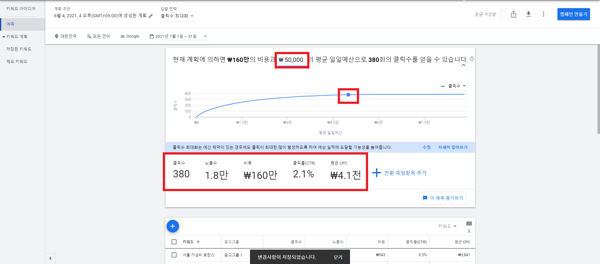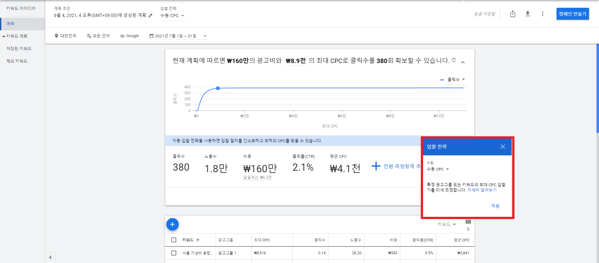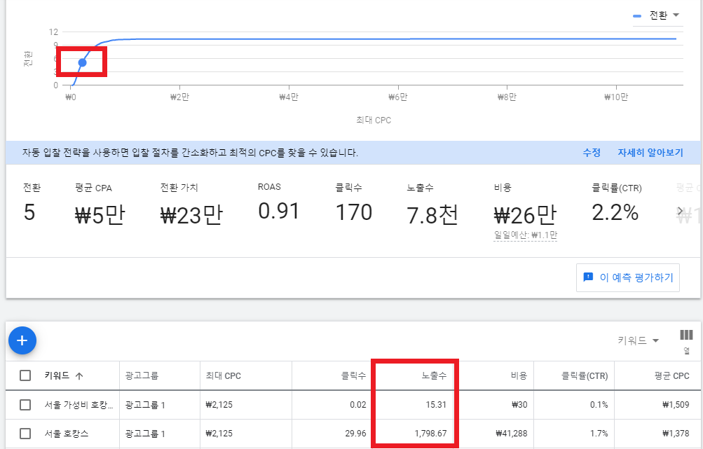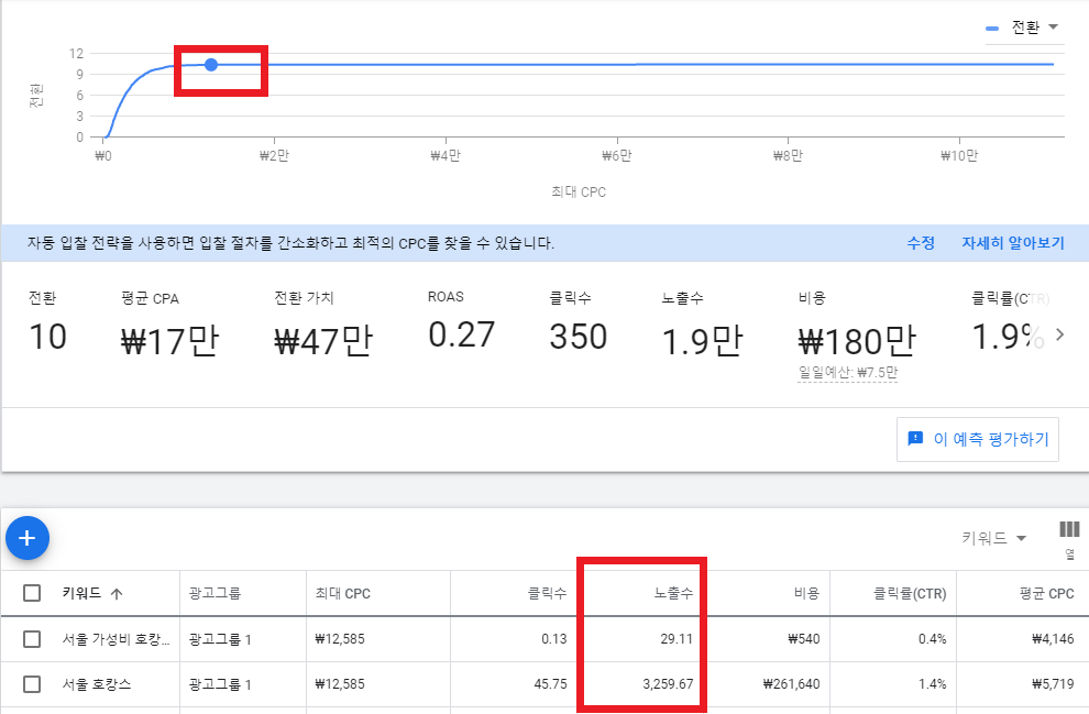 비용 혹은 최대 cpc를 입력할 때마다 그래프 바로 아래에 있는 테이블의 노출수 지표가 바뀌는 것을 볼 수 있는데