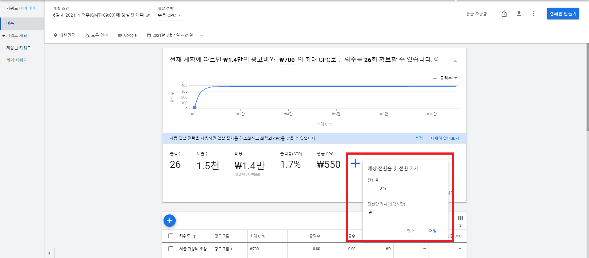 설정된 전환율과 전환 가치 그리고 입력된 광고비와 최대 cpc로