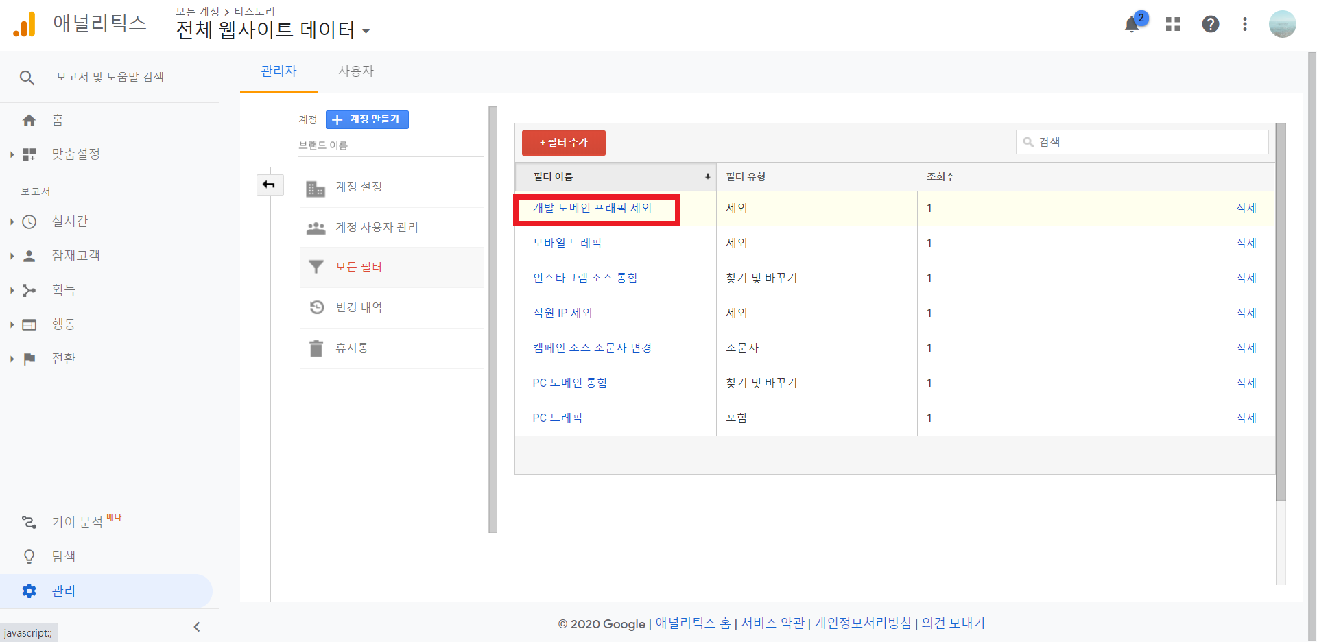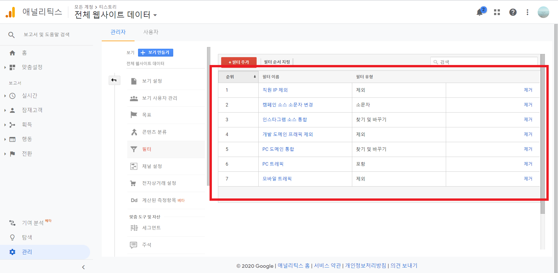 해당 계정 안에서 생성된 모든 필터가 보이게 됩니다.