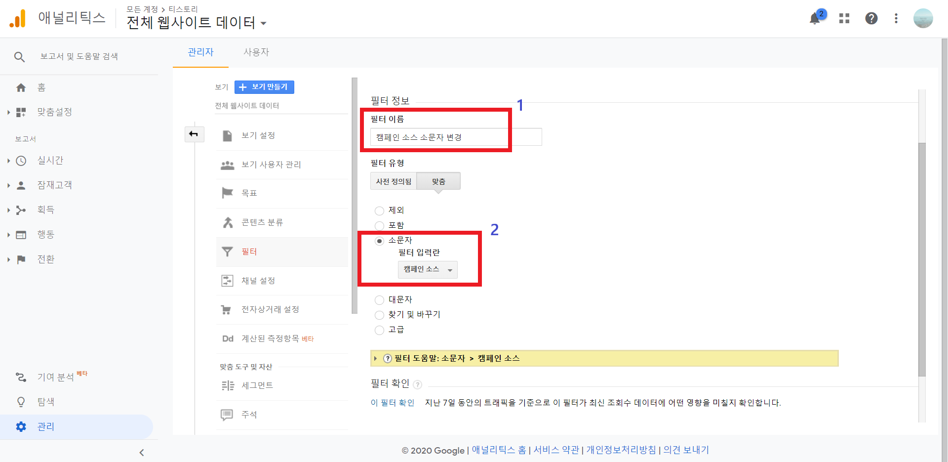 두 번째로 추천드리는 필터는 캠페인 소스 소문자 변경 필터입니다